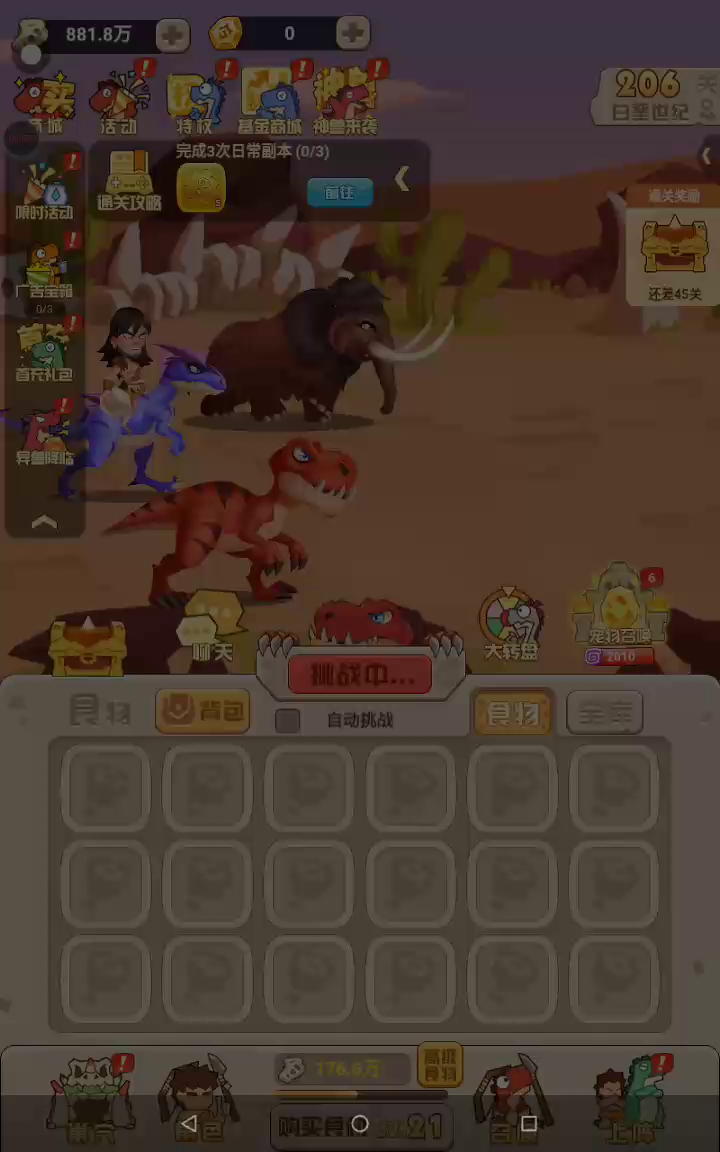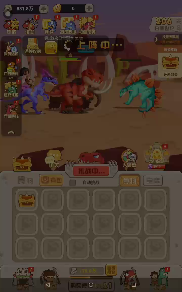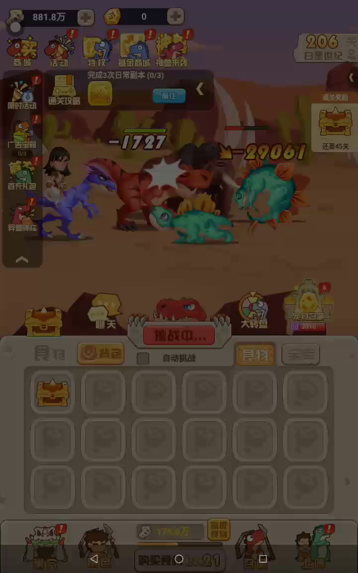《猎龙消消大作战》是一款极具特色的史前猛兽主题,合成养成放置类策略闯关游戏! 在游戏里,你是三叠侏罗白垩纪的豹皮原始人,通过召唤各种各样凶猛霸气又Q弹的的巨龙猛兽,悉心养成它们,经营你的群兽军团,击败一只又一只恶龙BOSS,朝着山丘上的那棵树不断前进吧! 【游戏特色】 ▲Q弹画风,可爱霸气▲ 恐龙!猛兽!咦惹听起来就很吓人,你一定以为我们的画风很生猛吧! NONONO!Q版画风,QQ弹弹,大大的眼睛,小小的嘴,反差激萌程度拉满了有没有! 长脖子的龙,打起来会甩动它的脖子!像根皮筋一样,呆萌呆萌的 _(:з」∠)__~ 面色凶狠的熊,打起架来居然嗷呜嗷呜挥动小爪!超可爱有没有 (*╹▽╹*) 究竟有多可爱呢,搞快点!加入我们,加入原始人驯龙大队吧! ▲超多猛兽,自由搭配▲ 单抽!十连抽!许愿池!太多种方法能get到船新的猛兽了 迅猛龙,三角龙,雷龙,霸王龙,朱雀,金刚........超多种类的巨龙猛兽等你来召唤! 太爽了吧! 酱紫多的猛兽,怎么搭配捏? 不要怕!转动你的脑瓜,灵活布阵,怎样酷炫牛逼怎样来! 你可以选择纯陆地战车巨龙队:阿马加龙x棘龙;食肉牛龙x鲨齿龙;砂犷兽x霸王龙...... 也可以组建天空霸主飞龙大队:翼龙x骇鸟x朱雀...... 甚至还能组建一只异种奇兽军团:猛犸象x剑齿虎;金刚x年兽...... 太酷了吧! 打开你的脑洞~~~组建一只战无不胜的猛兽军团吧~~~至于怎么组,亲自来玩玩就知道啦! ▲放置合成,究极进化▲ 放置挂机式的战斗~彻底解放你的双手 挂机获取资源,合成猛兽们的草药口粮,强化它们,培养它们,爱护它们 然后~ 它们就会进化了(配合动画)!!!!!!!!!!!!!!!!! 更加精美炫酷的画风,更加磅礴霸气的攻击,家有巨兽终长成的成就感真的很赞 召唤到新的S,SS级龙了,以前用的想退化,可以吗? 没问题!分分钟还给你用过的进化资源!强力猛兽任意强化,麻麻再也不用担心我资源乱用了! ▲玩法多多,乐趣多多▲ 紧张刺激的困兽场,实时和其他玩家对战,看看到底谁的军团更牛! 神兽之魄!获取猛兽精华,壮大你的巨兽,冲击排行榜榜一大哥! 副本之战,高难爬塔!检验你军团战斗力的时刻来了,你能爬多少层呢?不会有人连10层也打不过吧,不会吧不会吧_(:з」∠)_