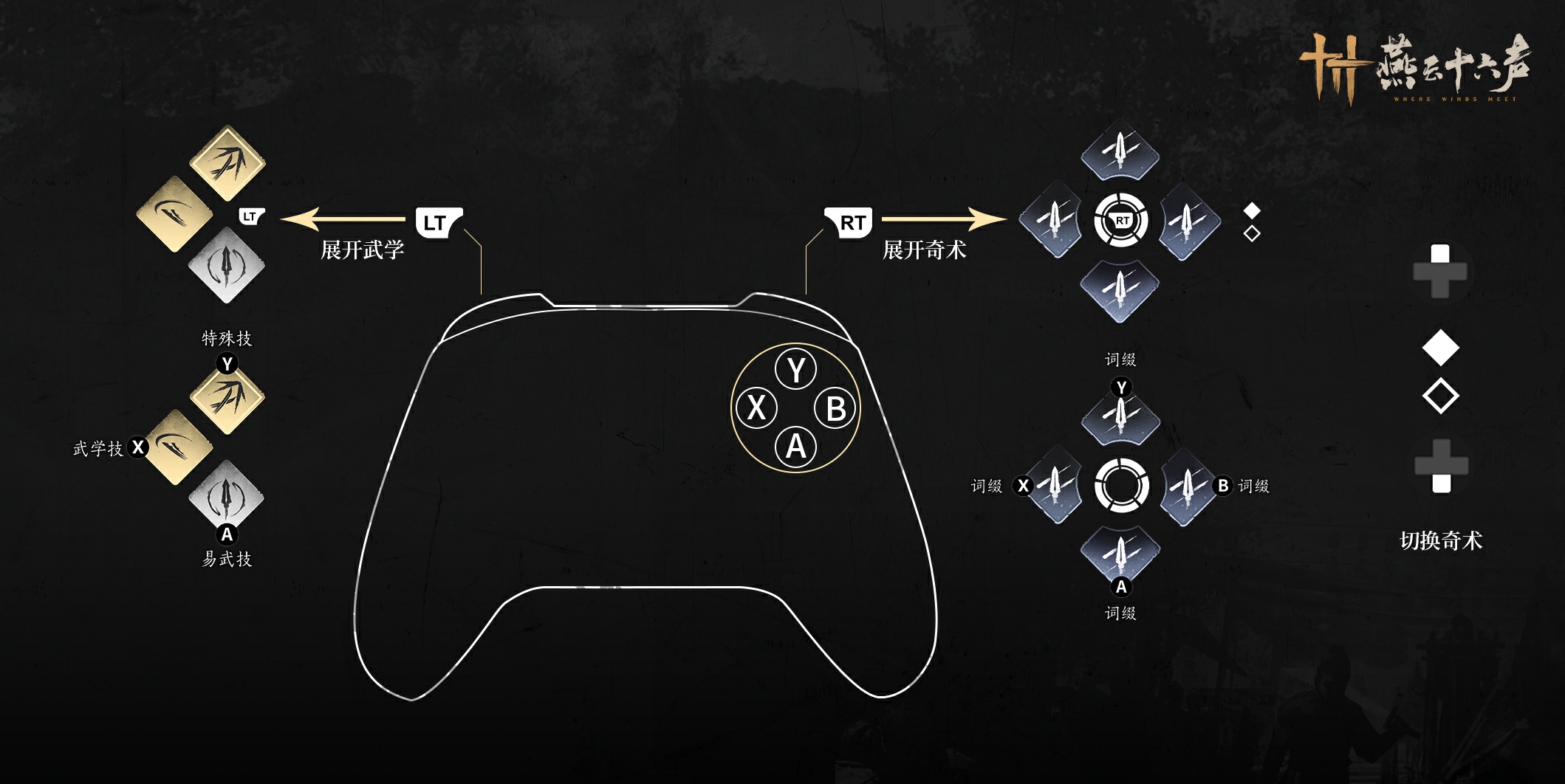 现在,我们优化了交互逻辑,LT/RT唤出奇术/武学界面后,所有释放都放在了右手边的ABXY。