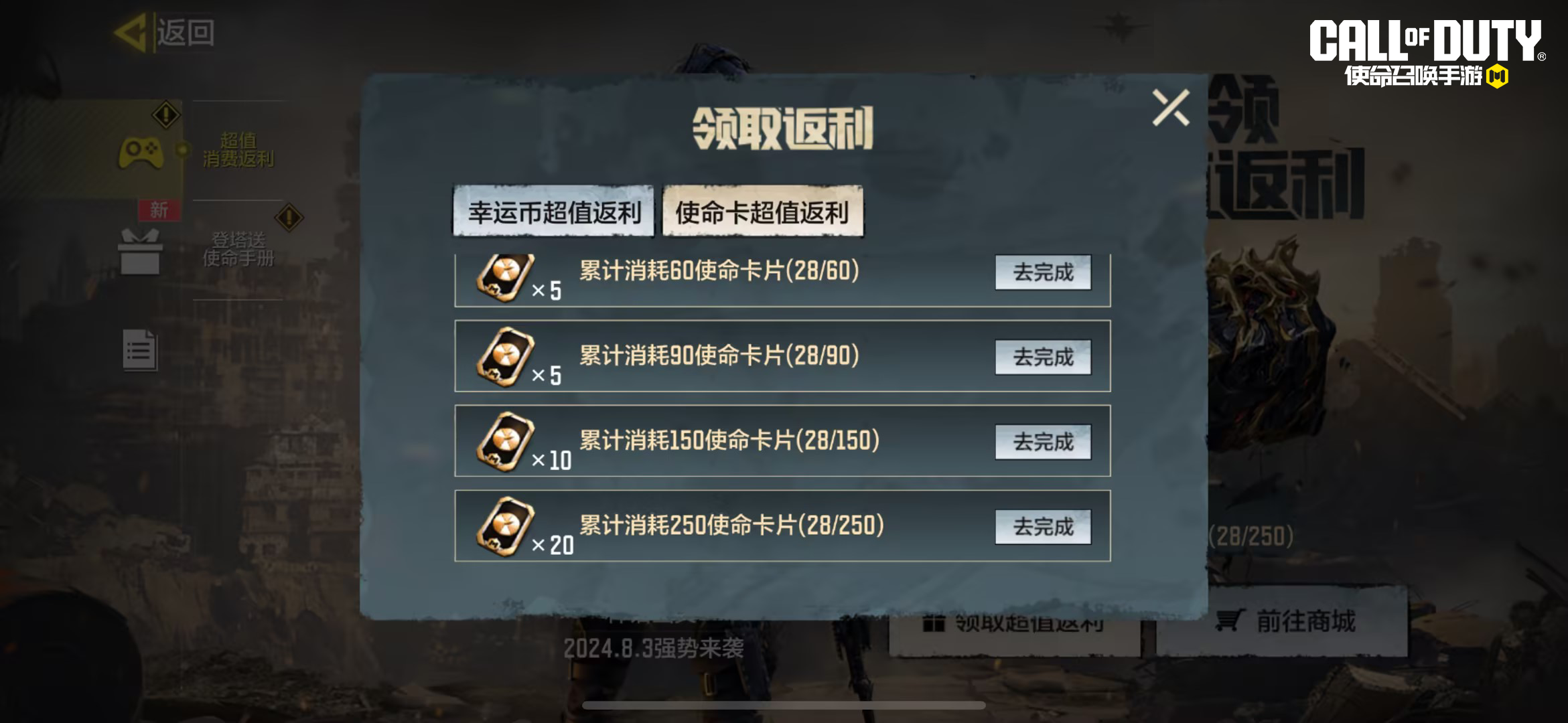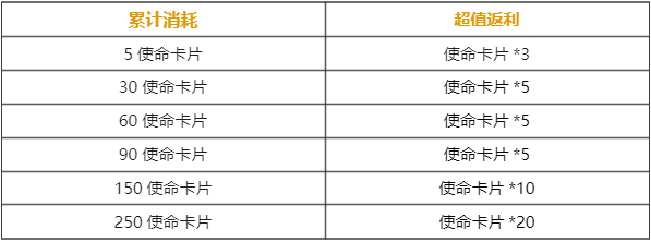 除了充值返利以外,累计消费领超值返利活动也将正式接棒。8月2日-9月7日,战士们完成特定消费任务,即可领取使命卡片、幸运币等超值奖励!