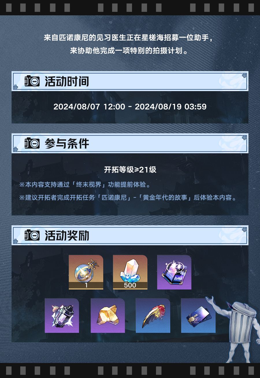 来自匹诺康尼的见习医生正在星槎海招募一位助手,来协助他完成一项特别的拍摄计划。