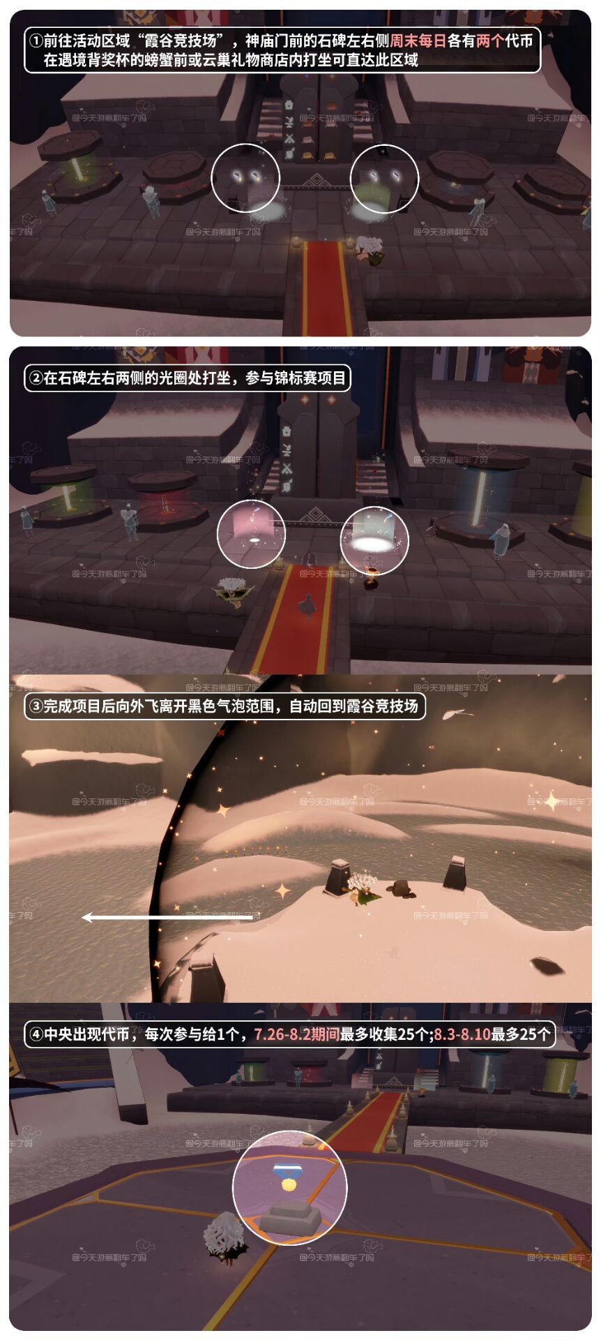 「参与锦标赛」进入霞谷竞技场,在神庙门前石碑左/右光圈处打坐参与并完成一场锦标赛