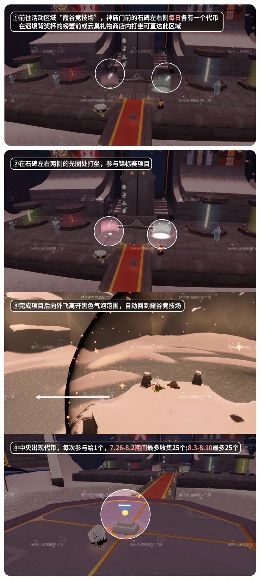 「参与锦标赛」进入霞谷竞技场,在神庙门前石碑左/右光圈处打坐参与并完成一场锦标赛
