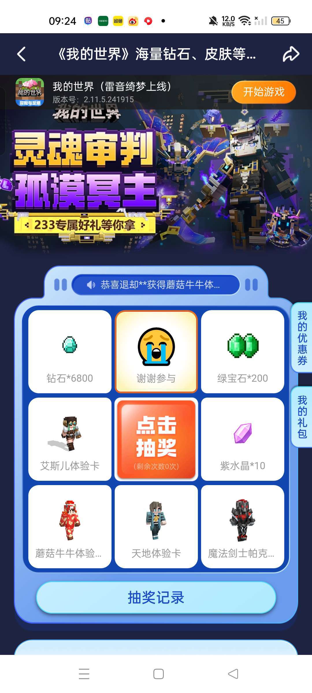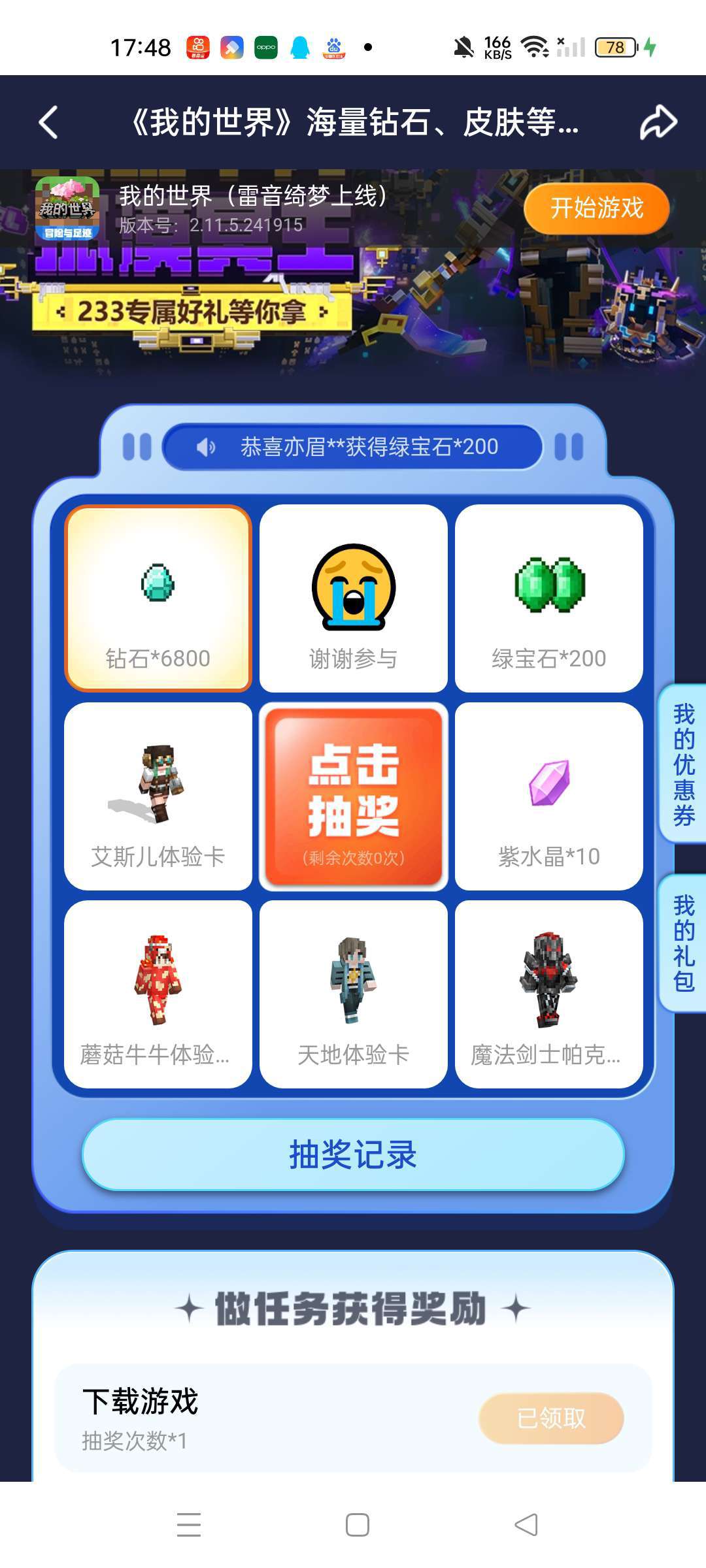 证实过了第一次抽的时候,会抽到一些好的。以后抽几乎全是谢谢参与,我几乎每天都是领任务奖励。建议无视。