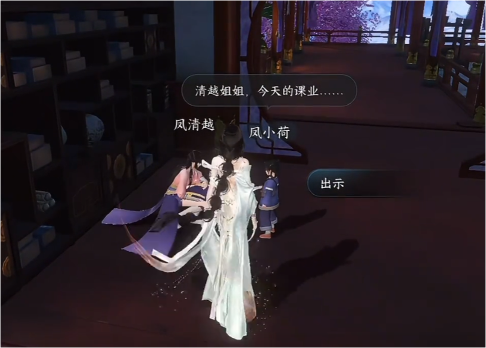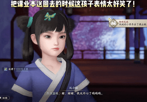 各位玩家来到(1437,861)可以看到小孩姐凤小荷正在向姐姐“哭诉”课业本弄丢了。
