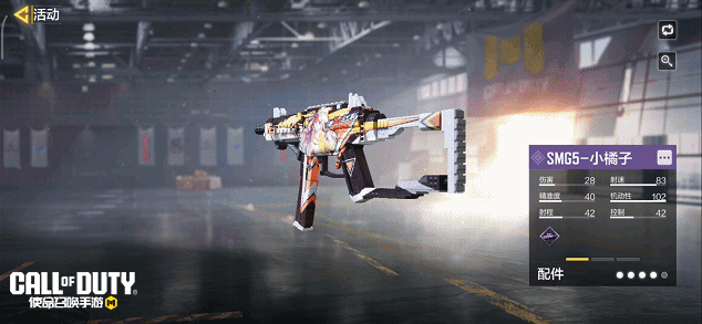 SMG5-小橘子的枪身采用橘黄色撞色涂装,用来彰显青春活力。枪身中部的专属小橘子立绘鲜明亮眼。每一场战斗,每一次冒险,SMG5-小橘子都将是最得力的伙伴。它将协助战士们极速冲锋,争取胜利。