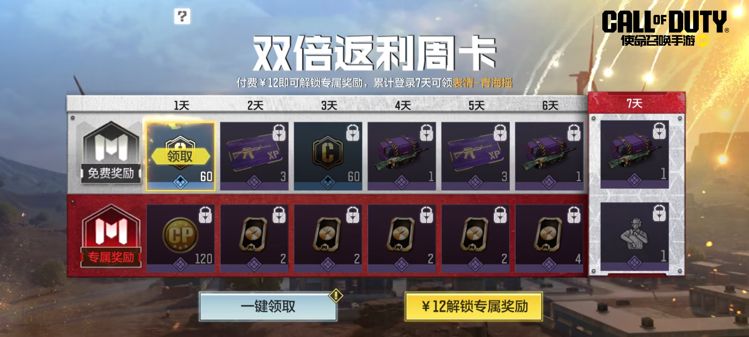 8月9日(本周五),双倍返利周卡上线。战士们花费12软妹币购买周卡,累计登录7天可以领取120 COD点券和使命卡片*12。