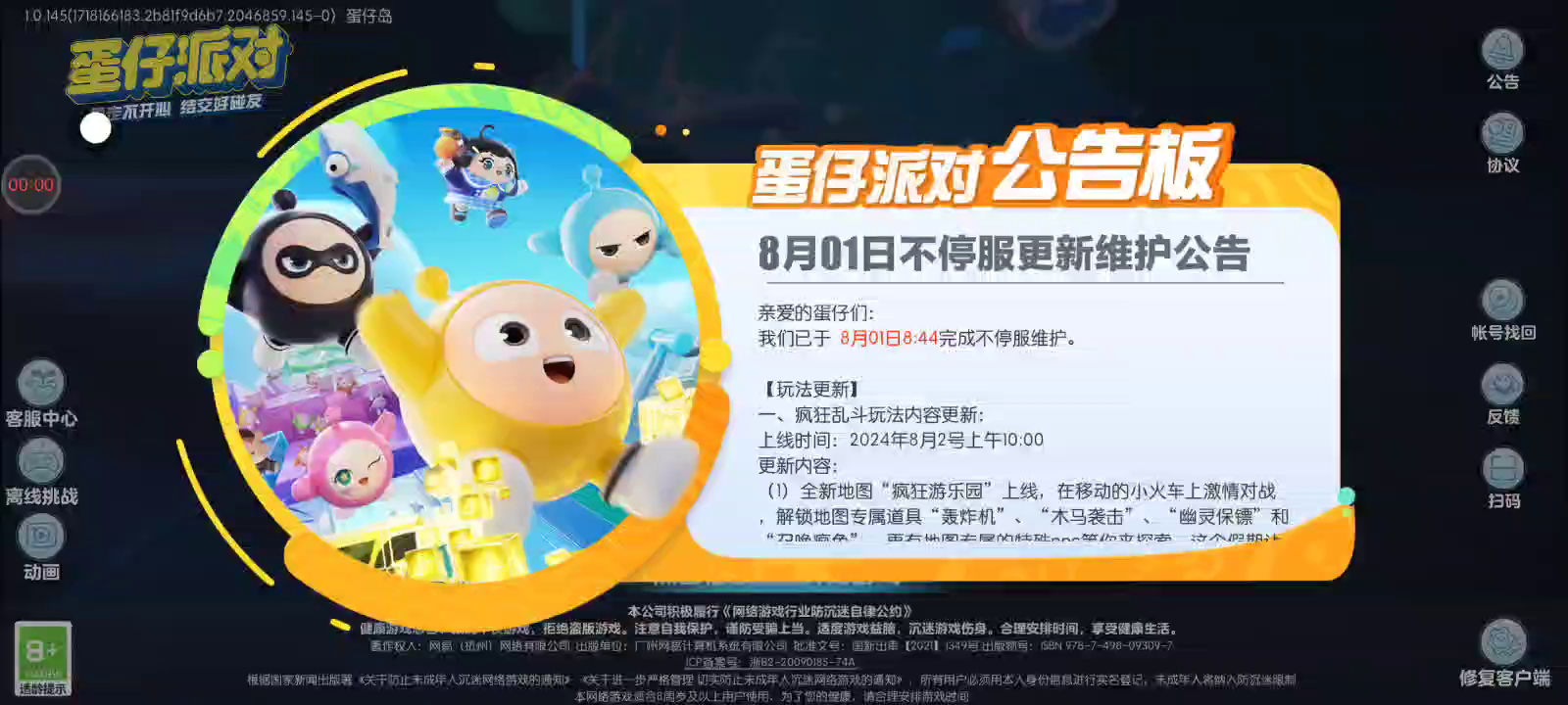 【较旧的游戏版本可能遇到无法充值问题,请更新游戏版本后再次尝试,给您带来的不便敬请谅解。】 《蛋仔派对》7月26日暑期大版本《疯狂动物城》联动重磅上线! *<朱迪蛋><尼克蛋><闪电蛋>盲盒上新,集齐联动外观送载具<交通车>!* *<1元打卡手册>活动解锁<兔耳头饰><大甜甜圈>等奖励* *<动物城游览>活动联动外观<芬尼克小象服>、<爪爪冰棍>免费赠送!* *<狂欢星期六>免费领彩虹币宝箱、配饰<炫紫蝶形镜框>* 【黄金盛宴开启,恶人全员齐聚!】 全新派对季“深海逐金宴”开启,关注这场危险重重的黄金盛宴,猜测最后的赢家,探寻黄金的秘密,逃出深海,重获自由! 【全新关卡 深海的奥秘等你探寻】 跟随洋流穿梭于海底,躲避贝壳障碍;坐着魔鬼鱼顺水而行,参观海星与海螺的海洋美景;和剧毒的水母做游戏,在珊瑚礁间躲避放电的海葵;深海寻宝,与珍珠来一次亲密接触;在沉船中追逐黄金,从深海章鱼的触手中逃脱险境! 【派对季盲盒 全新来袭】 深海“恶人”集结!与海豚作伴,自由自在的怪盗大小姐——浪花黛露珊;昔日海上富商,风度翩翩的西装“暴徒”——大亨波利;行于黑暗,神秘莫测的致命行者——幽猎塞莉诺,还有“笑面虎”古董商叨爷;“铁憨憨”拳手迦克;“欺诈师”发牌员贝丽丝……这些赴宴者各怀鬼胎,却对黄金势在必得。 【全新派对季 福利多多】 1.参与全新派对季的活跃任务,潜入深海,探索黄金的秘密,即可解锁深海中的奇遇探险“潜海探险家”外观; 2.派对季段位重置,挑战段位任务获得“雪豹阿啸”、“洋流海龟”外观。 3.完成本派对季派对手册任务,即可获得“流浪寄居蟹”、“沙雕堡垒”等外观;