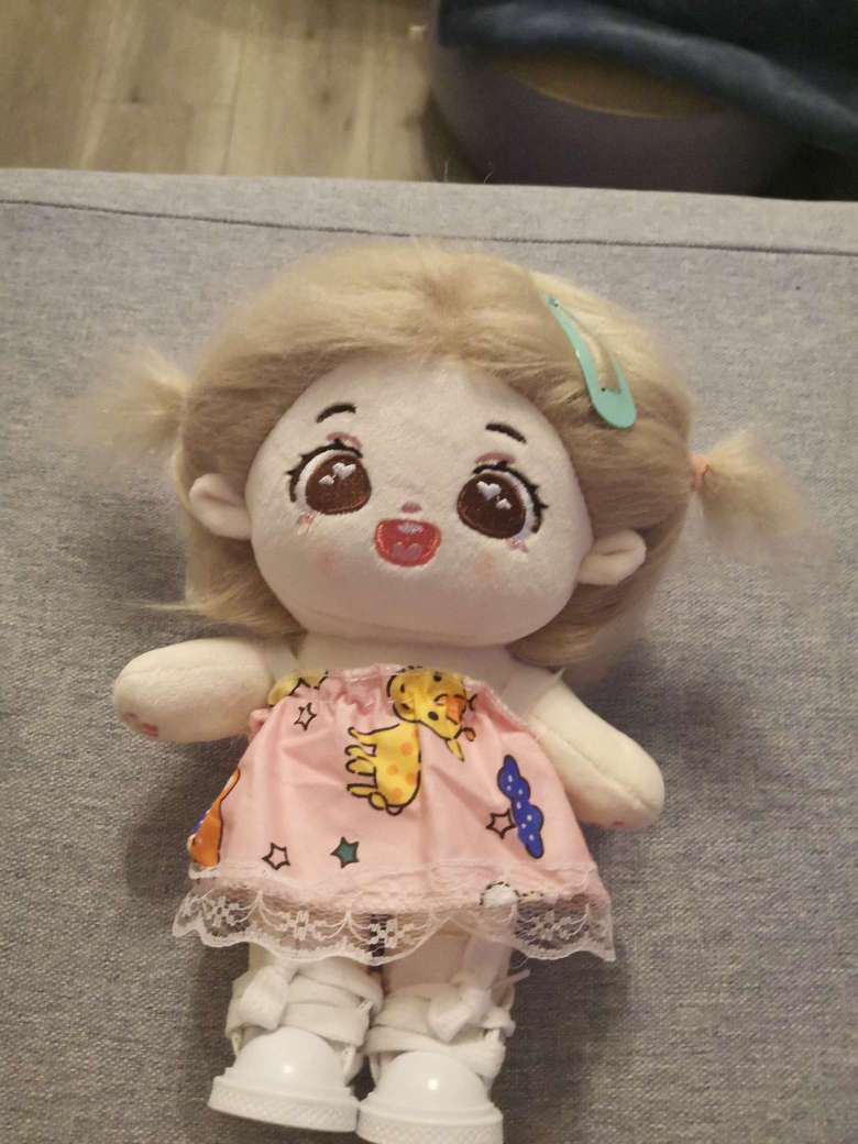 嘿,看这件布丁狗的衣服好看吗?要我给娃娃扎的发型,这个生日的帽子和这个衣服真的超好看