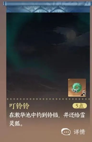 昆仑虚怪事连连,水池边更是诡异异常。不要频繁在漱华池内钓鱼,有概率钓到鱼类以外的东西。若是钓到了铃铛,可能会被一些神秘力量纠缠,长时间泡澡可能会陷入幻境。不过不用担心,在幻境找到一只小狐狸,出示钓到的小铃铛就可以达成成就【叮铃铃】。