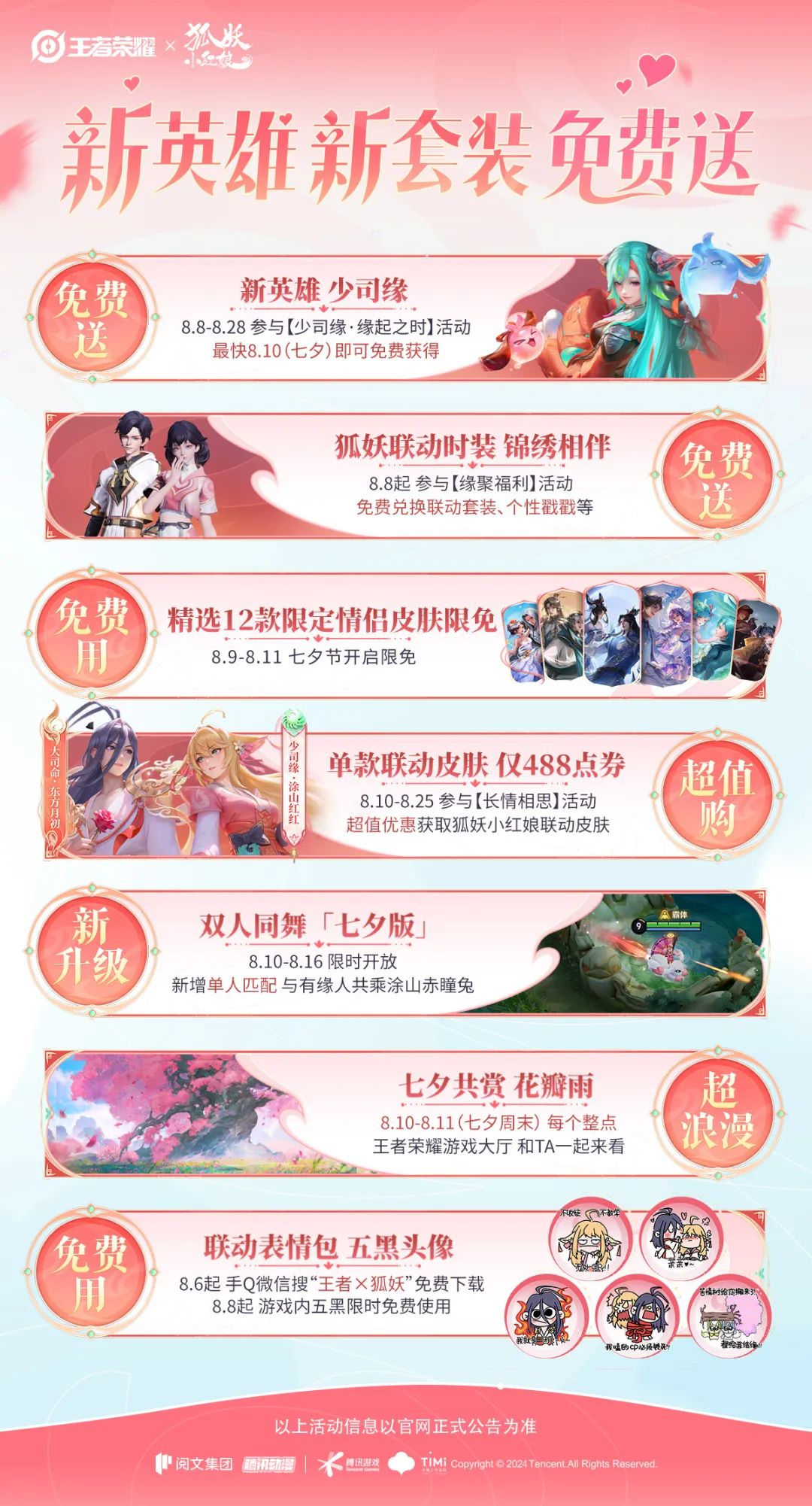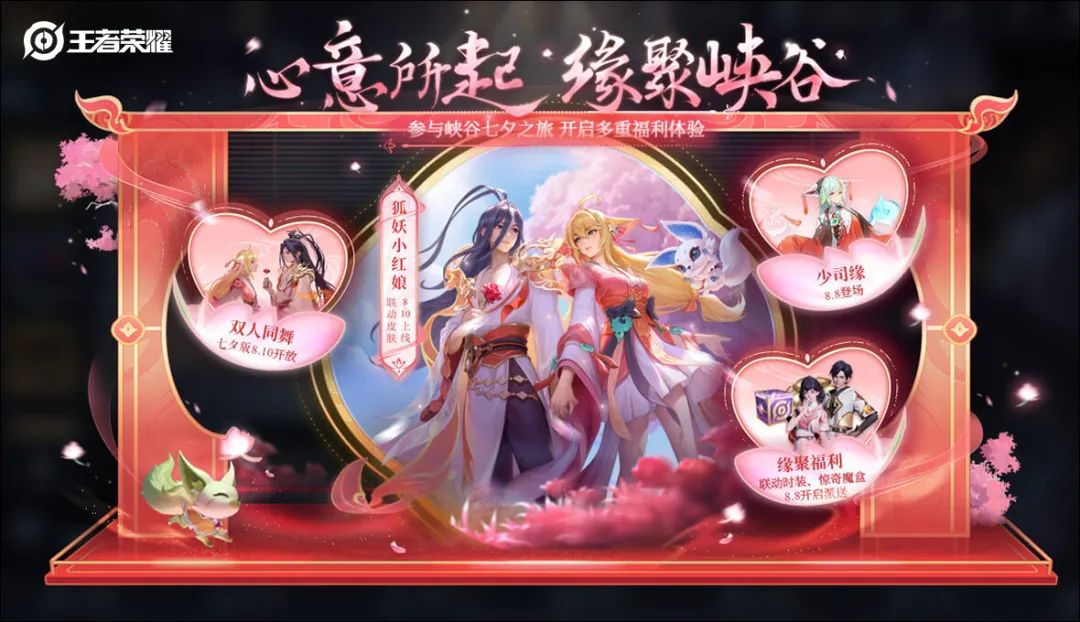 ♡ 活动介绍:完成【每日任务】、【收集七夕限定内容】、【双人同舞】任务,获得聚缘积分,兑换狐妖小红娘联动时装-锦绣相伴、惊奇魔盒、包含大司命在内的热门英雄自选宝箱、苦情树戳戳等丰富奖励。