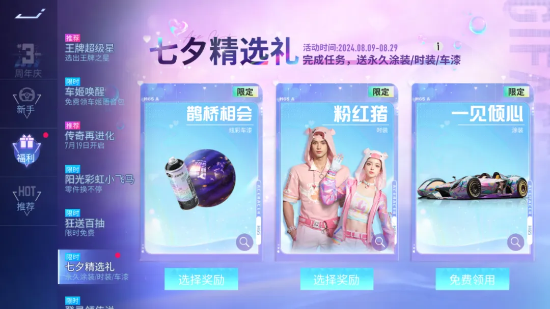 8月9日~8月29日七夕精选好礼来啦。三款礼物粉红猪时装、以太-一见倾心涂装、鹊桥相会炫彩车漆,完成任务积攒精选礼积分可以永久获取哦!快来参与活动将三份奖品都带回家吧。