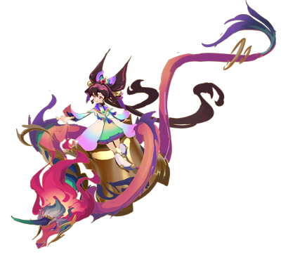 《西京赋·注》有云:“海中有大鱼曰鲸,海边又有兽名蒲牢,蒲牢素畏鲸,鲸鱼击蒲牢,辄大鸣。凡钟欲令声大者,故作蒲牢于上,所以撞之为鲸鱼。”在古代,人们认为把蒲牢雕刻于钟上,可令钟声嘹亮,传播悠远。所以,蒲牢常作为钟钮而存在。根据这些元素,我们将角色设计为坐在钟上的小姑娘,同时辅以鲜艳明亮的配色,凸显角色活泼可爱的个性以及皮肤整体的趣味性。