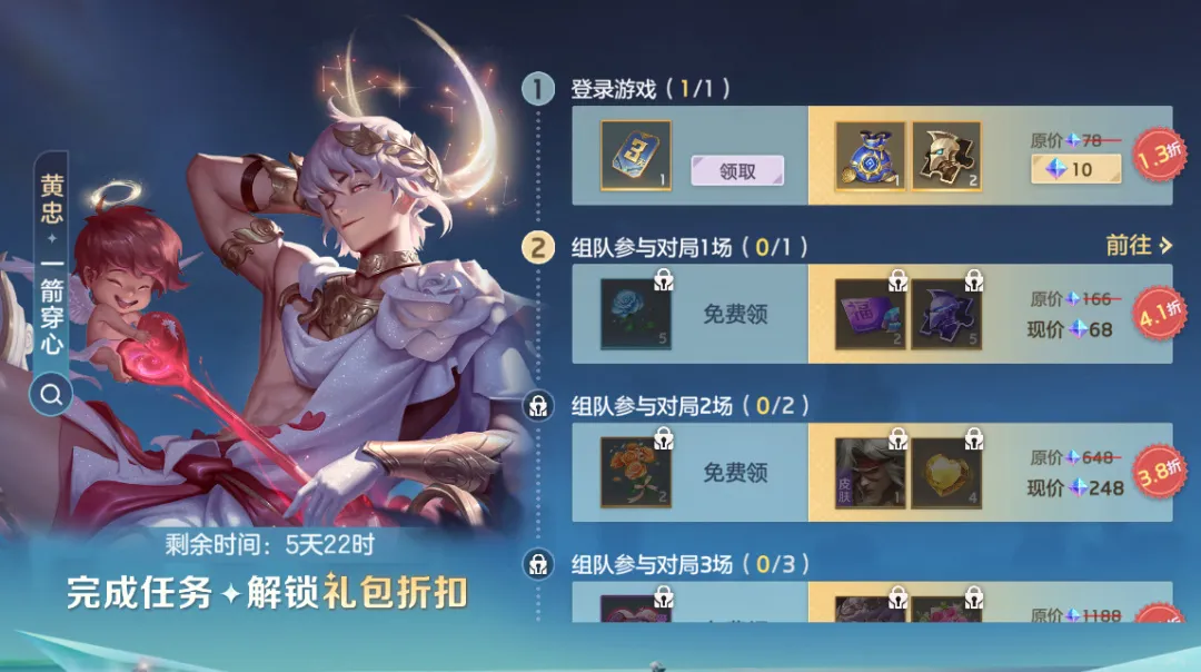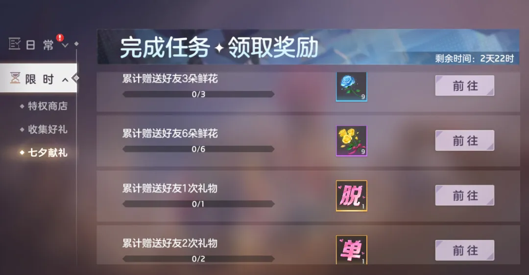 完成任务,解锁礼包折扣;完成全部任务,可免费获得头像框“七夕鹊情”、表情“爱你哟”、3天组队buff特权卡等奖励