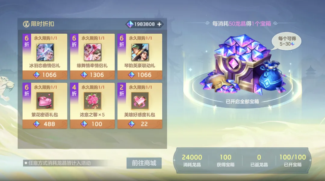 每消耗50龙晶可开启宝箱,每次开箱可获得5-30龙晶。游戏内任意龙晶消耗行为均计入本次活动。