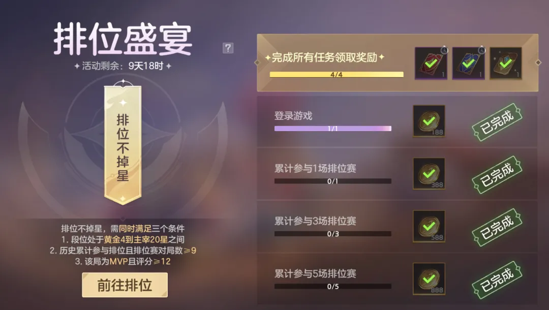 达到指定条件,排位赛败方MVP不掉星。完成任务可获得排位守护卡、排位加星卡、3天满级星盘特权卡等奖励。