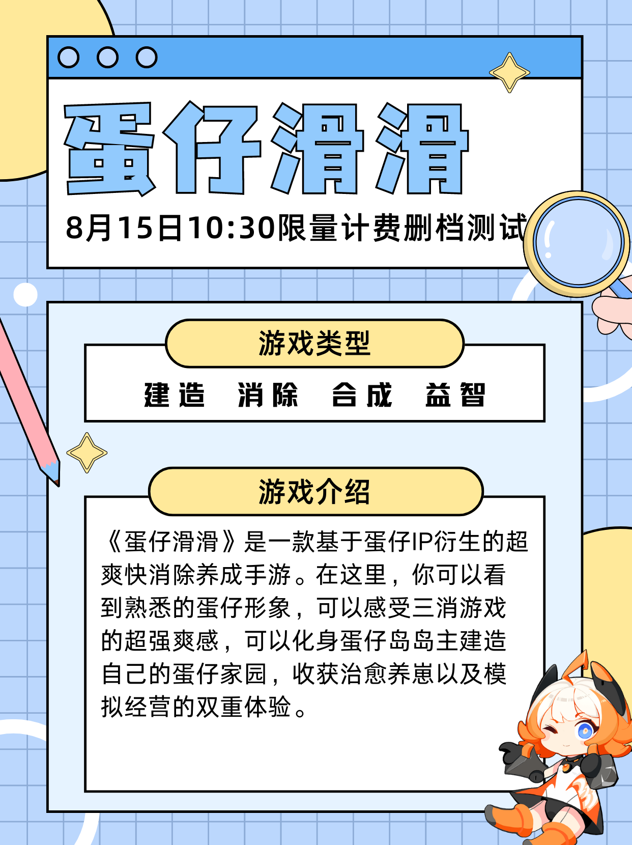 《蛋仔滑滑》:是从广受欢迎的国民IP《蛋仔派对》中衍生出的三消经营手游,已于6月6日开启首轮测试;