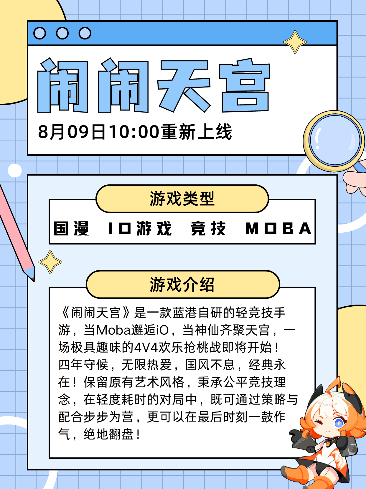 《闹闹天宫》:作为一款经典的西游国风4V4公平竞技手游,在2019年公开测试期间便吸引了众多玩家,如今也在期待着重生的时刻。接下来一起跟着沐晓霜的步伐走进游戏世界吧!
