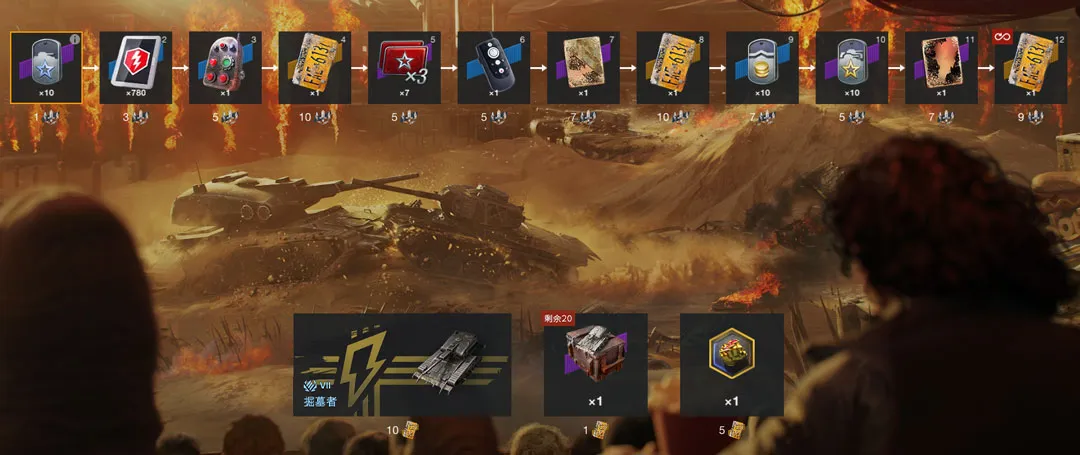 用它们完成活动阶段并兑换奖励:战斗经验强化剂、金币强化剂,3倍经验嘉奖令,遥控器,“叶斑”和“战争之焰”涂装...还有号码牌!您可以用它们兑换“残暴铁拳”传奇头像,掘墓者集装箱或直接获取车辆VII级掘墓者,它真的很酷。