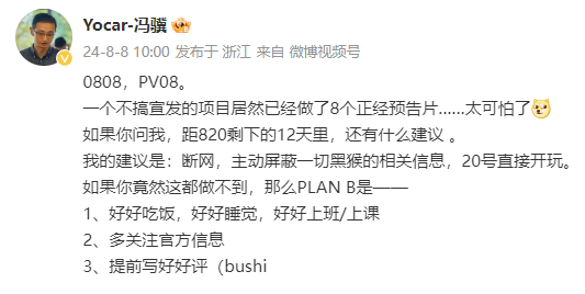 随后,游戏科学创始人、CEO,《黑神话:悟空》制作人冯骥发文表示,作为一个不搞宣发的项目,《黑神话》至今也发布了8个正经预告片。