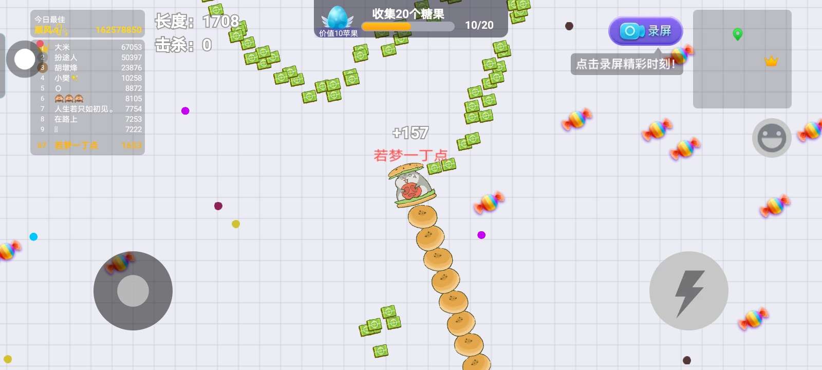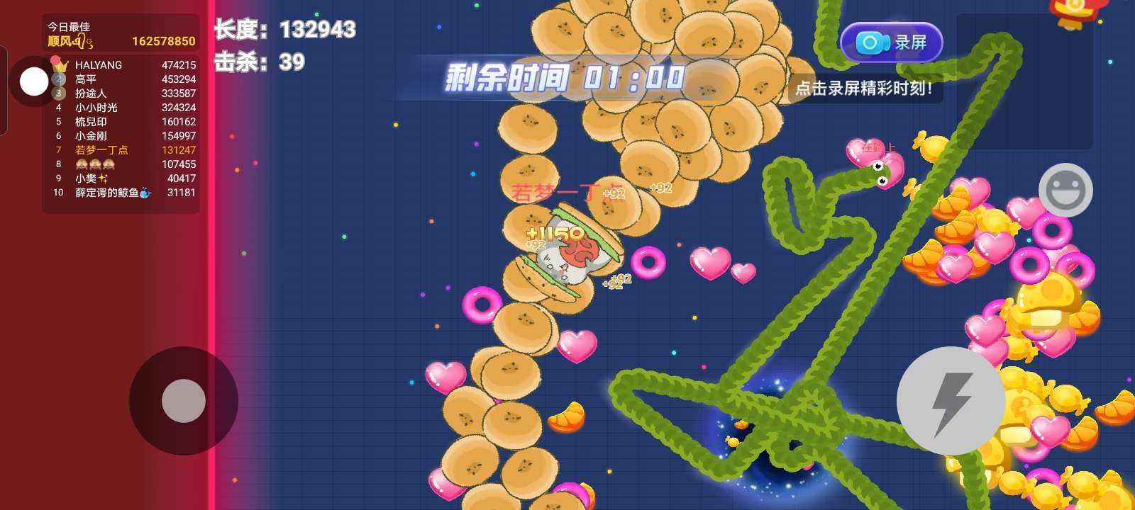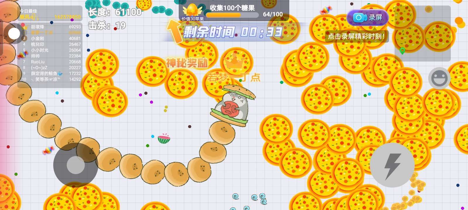 这时候的咱们已经是在排行榜上的前十名了,我们可以去猎杀一些小蛇和蛇王了,可以用歪头杀。秘诀:挨近蛇王,我们的头,跟蛇王的头,保持一定距离。不然可能会被秒,保持一定距离之后,一个歪头蛇王就直接没了,如果蛇王的尾巴蜷缩在一起,我们必须先吃尾部,尾部的分量最多,如果头部全搓,就吃头部!!!!!!