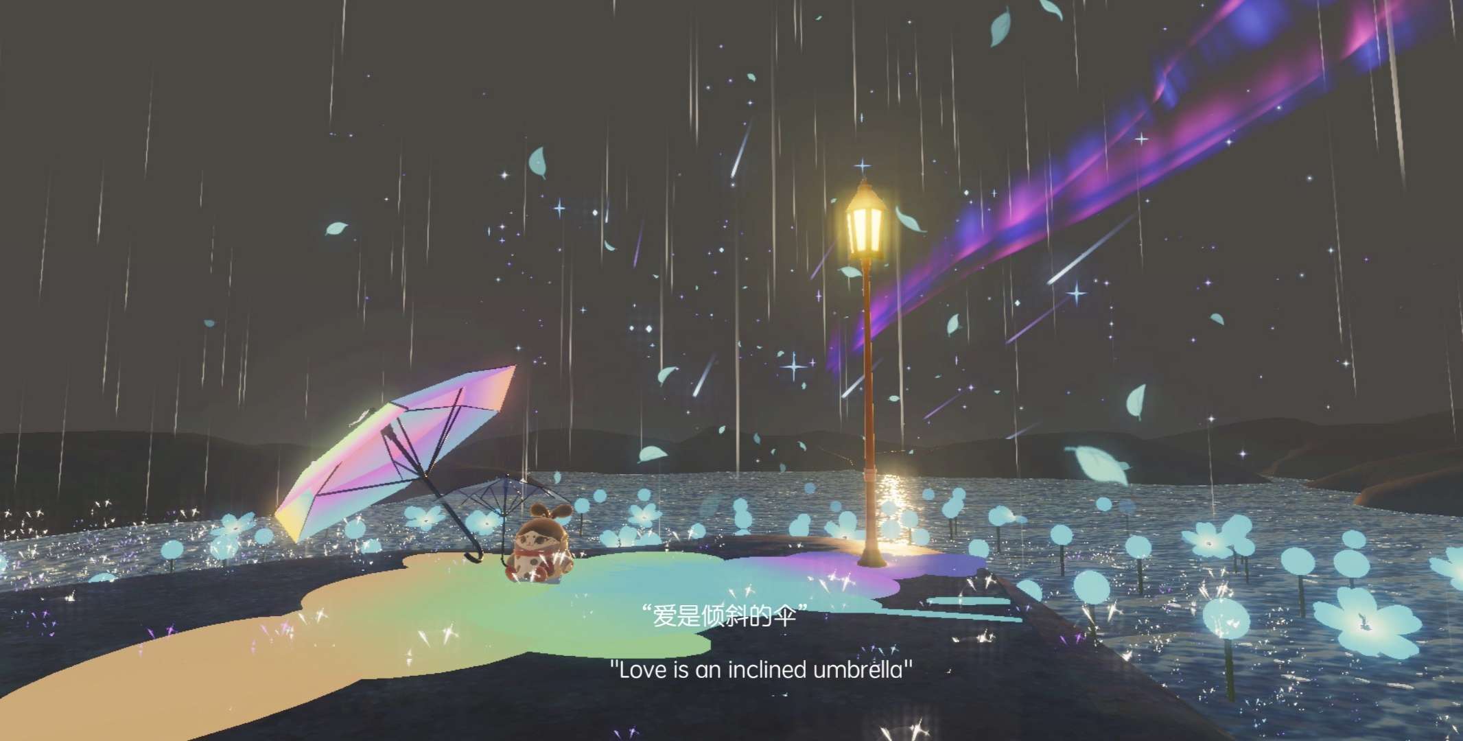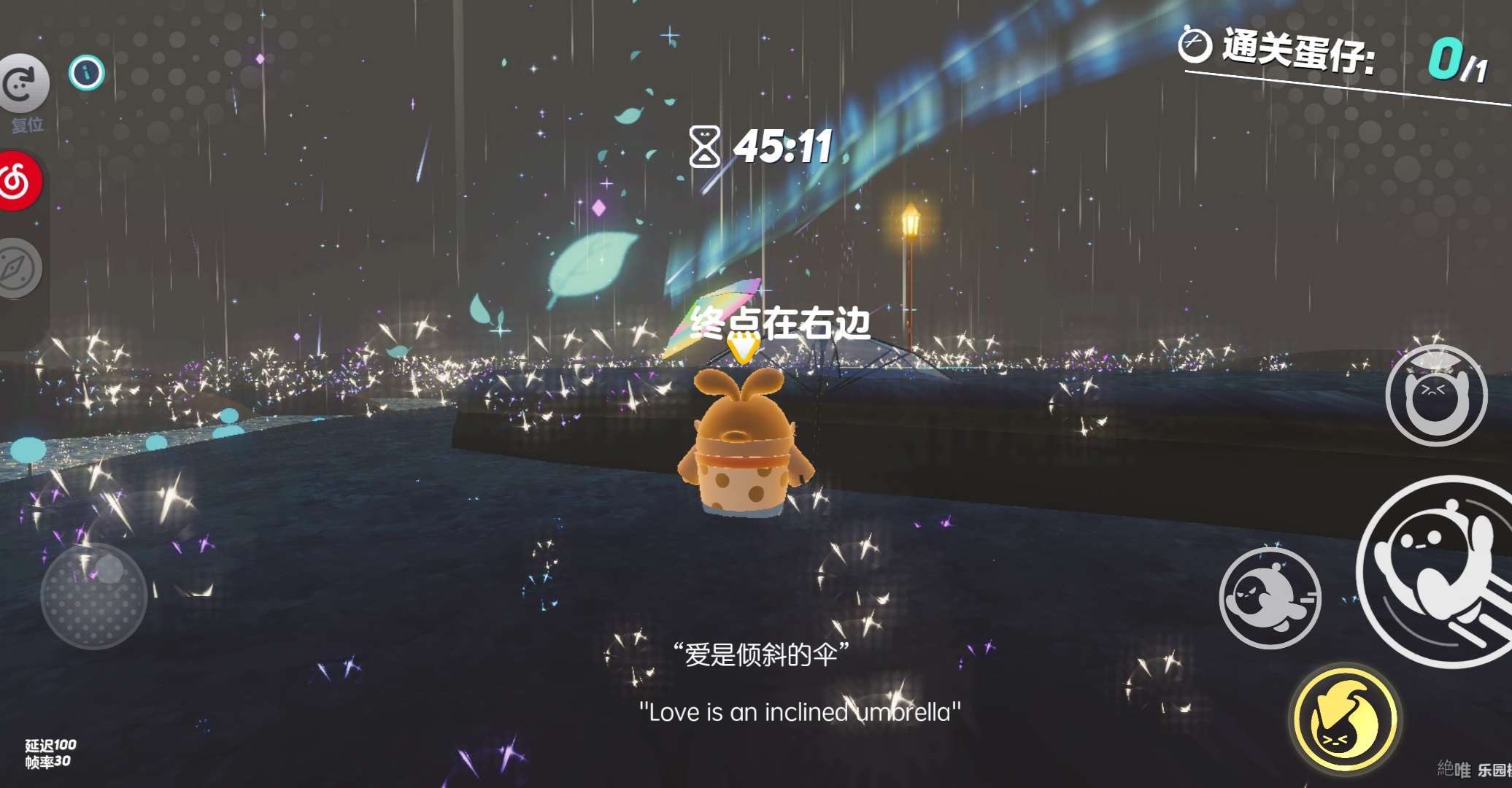 "或许,可以陪我淋雨"从左手边的楼梯下去就可以来到这个场景啦,瓦前面的雨伞触碰一下蛋仔就可以拿着啦~