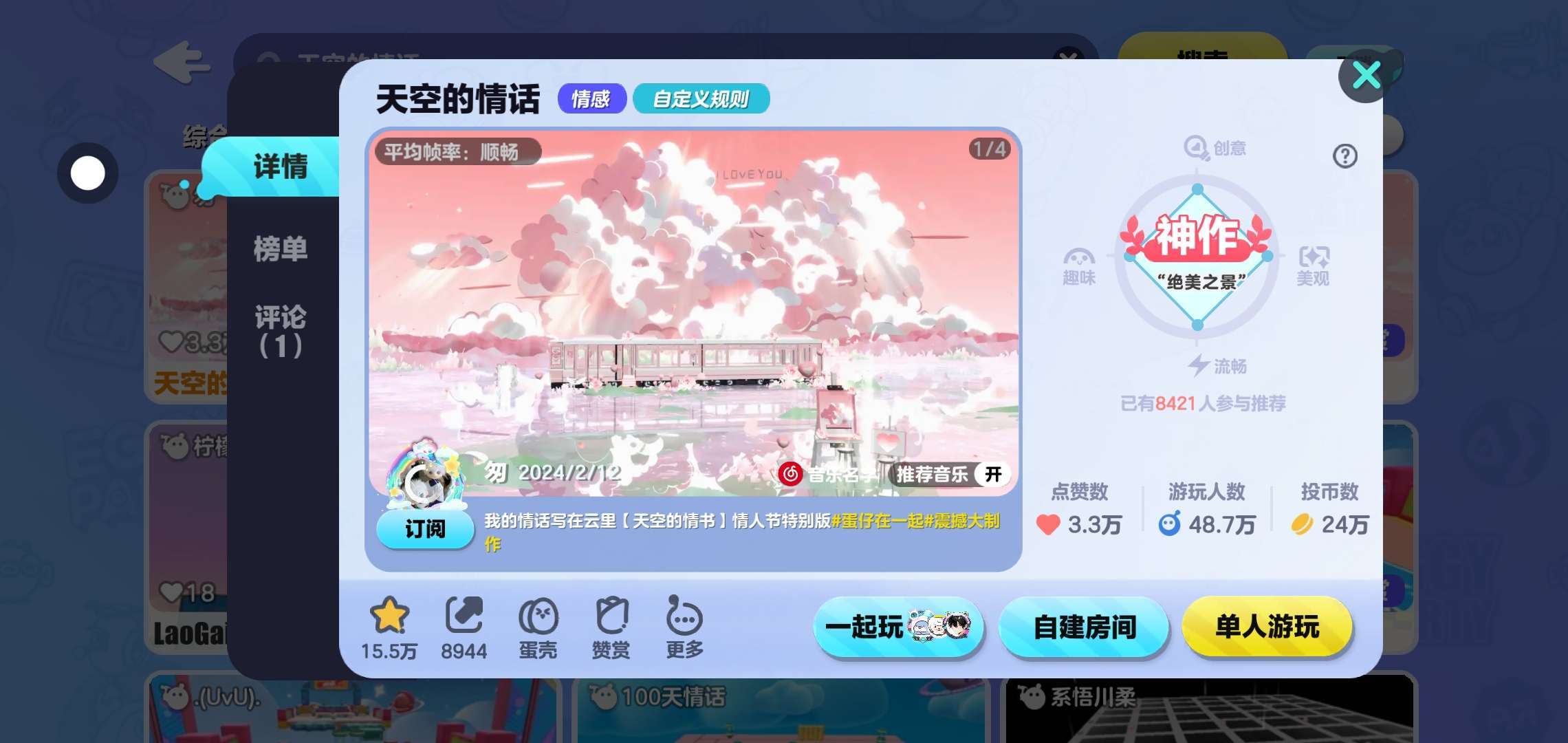 和细节 地图里面的文字也是触动人心!!!地图里面的美丽景象也是让我回忆满满!!!地图中有超多绝美风景 值得去打卡拍照!那就一起叫上蛋搭子来和自己玩这个超级好看和回忆满满的地图吧!(´▽`)ノ♪ “我按下暂停键 留下了回忆也留住了你.”“冷知识:你喜欢的人可能喜欢你⌓‿⌓”时间会冲淡一切 包括你和我 绝美的粉色地图,赶紧去叫上蛋搭子来和自己一起玩耍吧!