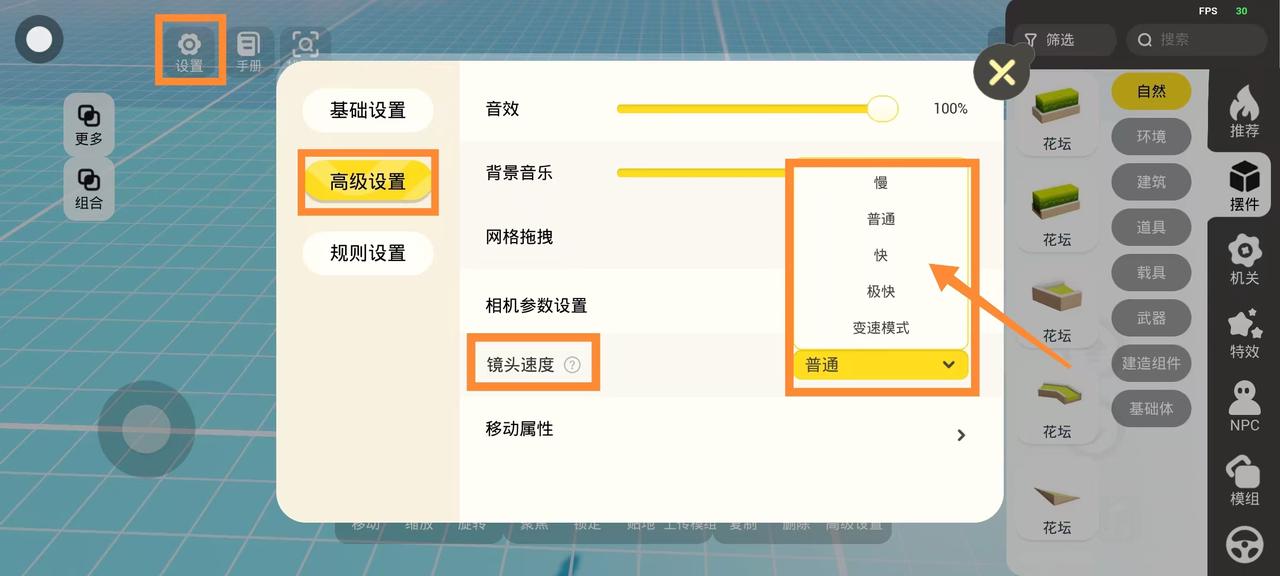在【设置】-【高级设置】,点击镜头速度,就可以选择不同模式的镜头移动速度啦!再也不用担心地图建造过大时,镜头移动速度过慢的问题啦!
