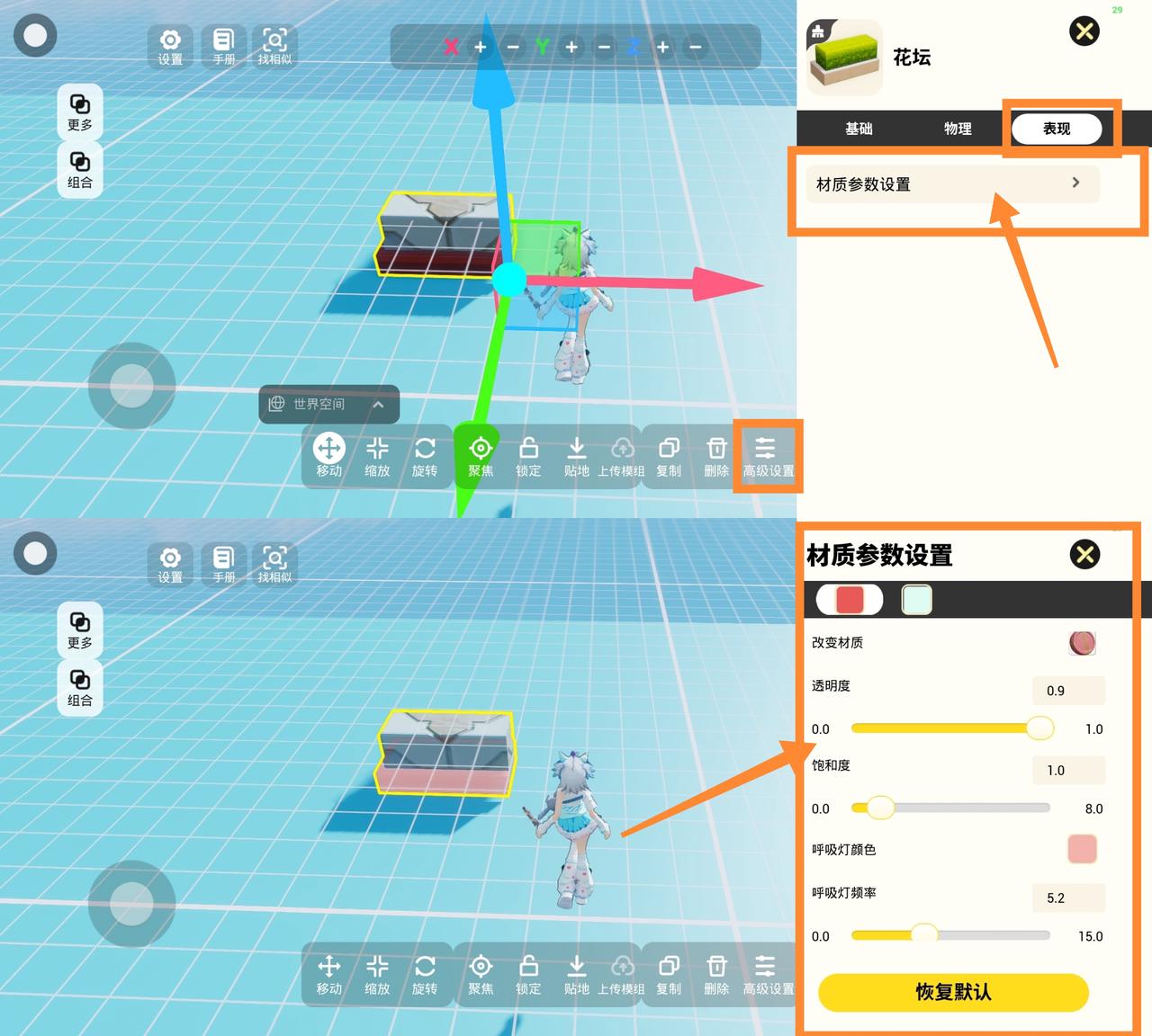 ②新增材质参数设置:选中物体,在下方操作栏的【高级设置】-【表现】,可以对物体材质选择、透明度、饱和度、呼吸灯等参数进行设置~