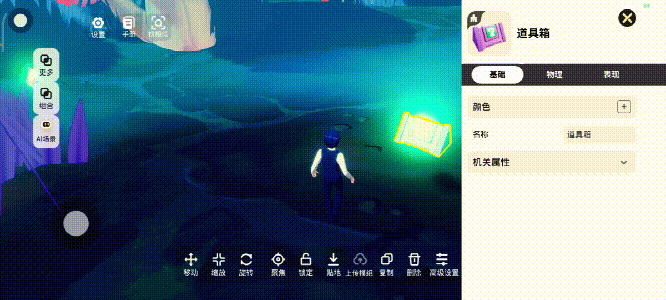 首先是摆放道具,在资源库中在玩法机关找到道具箱!