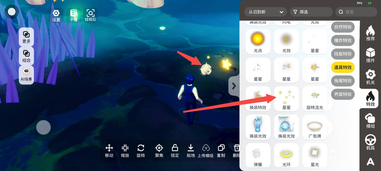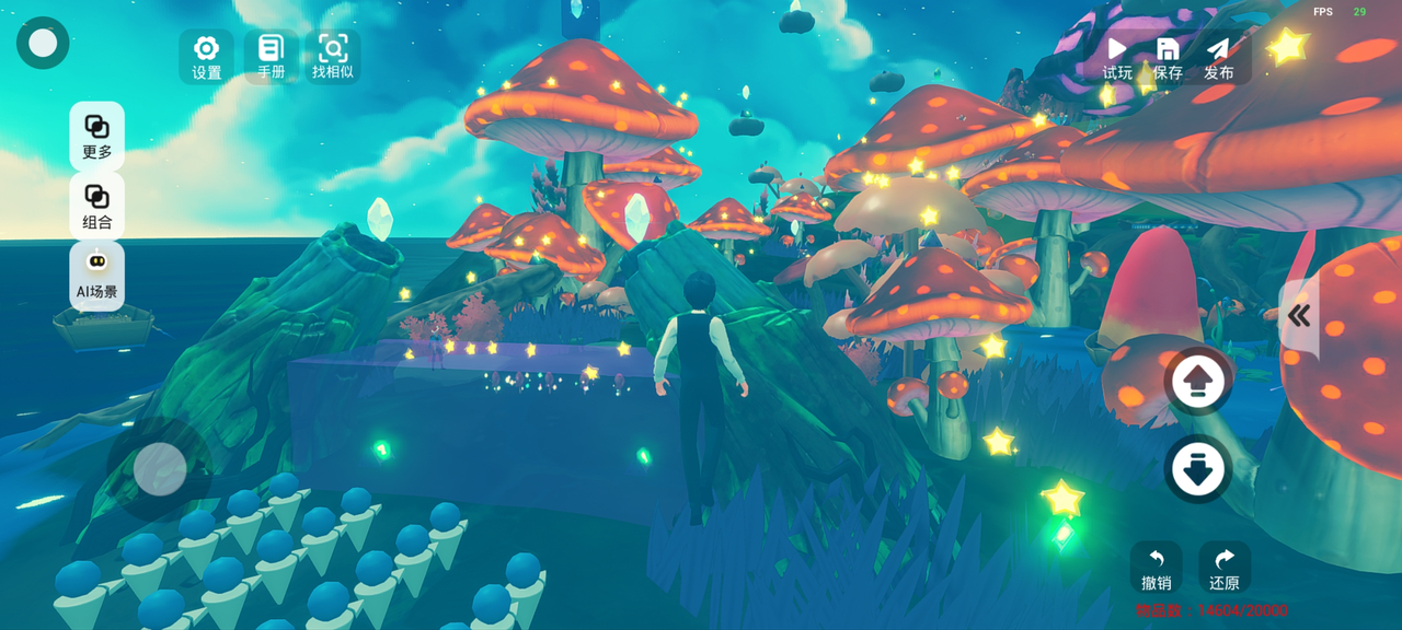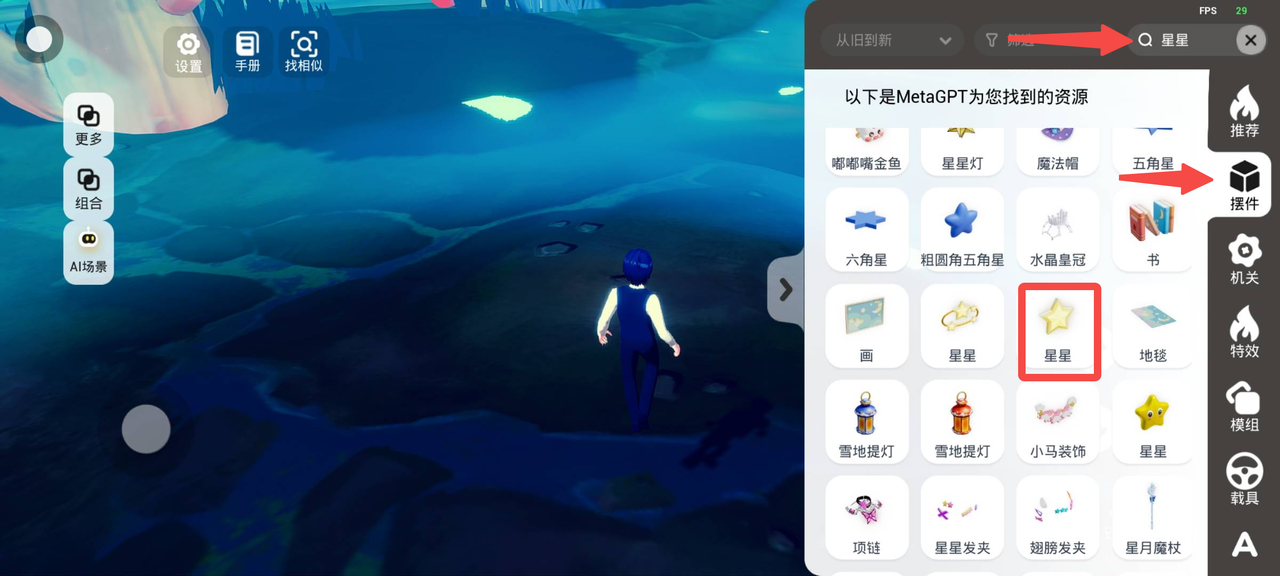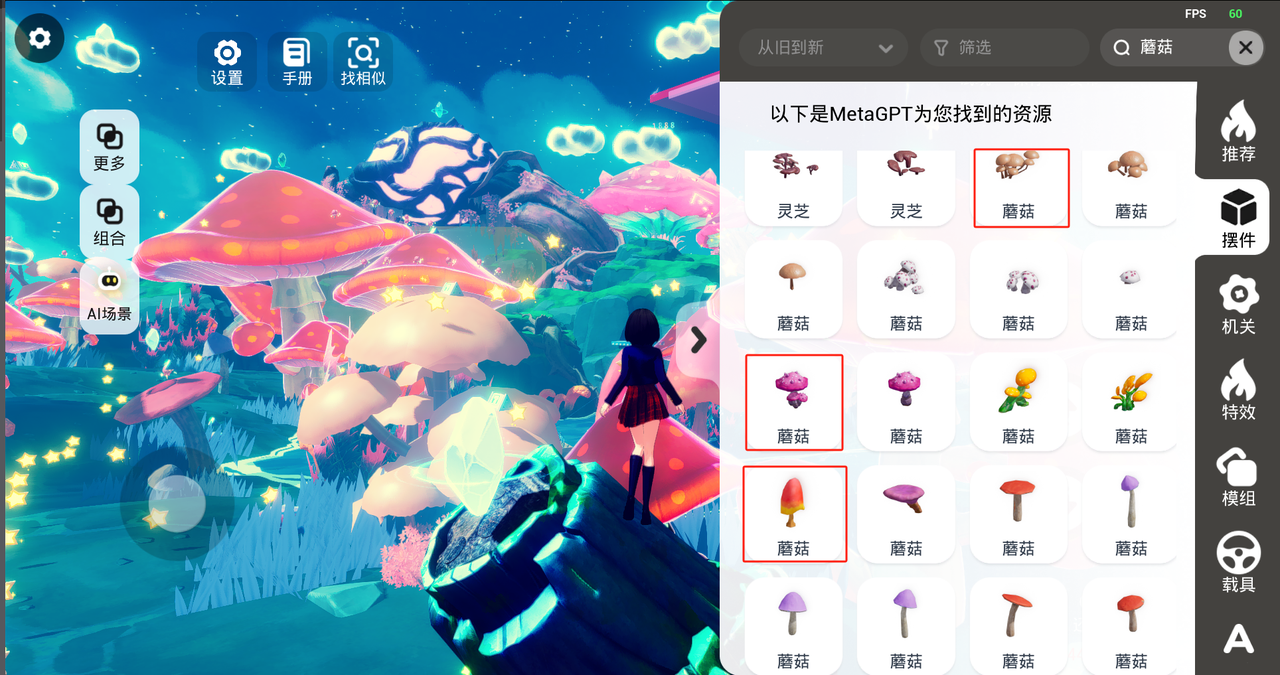 当然,场景中的这些巨型蘑菇,在摆件页签下搜索蘑菇就能找到啦!