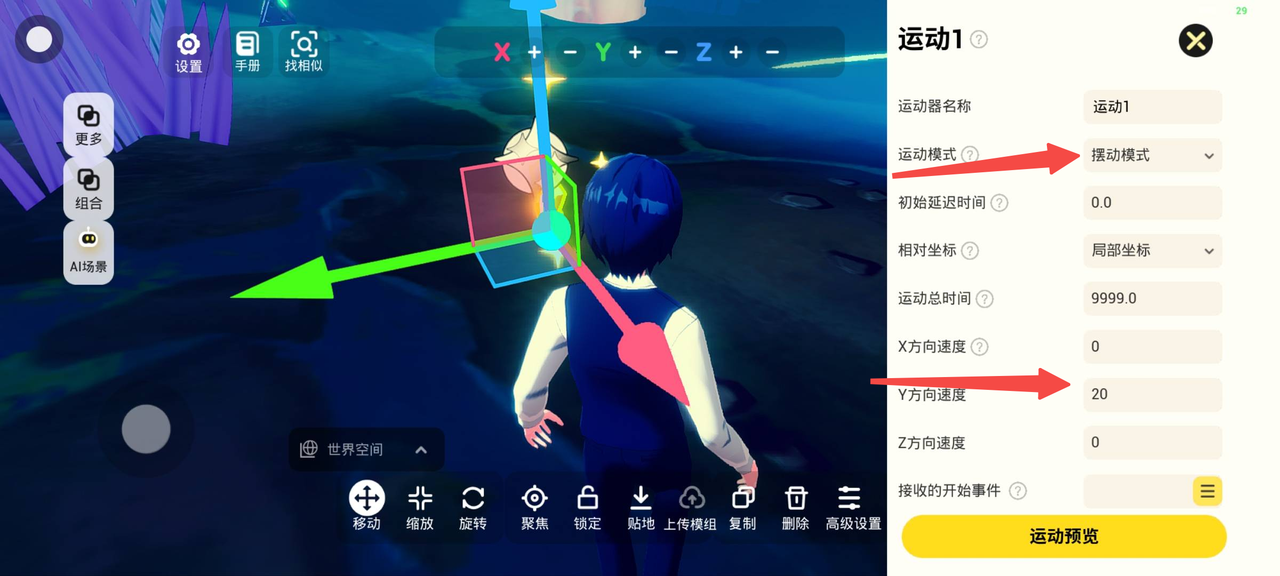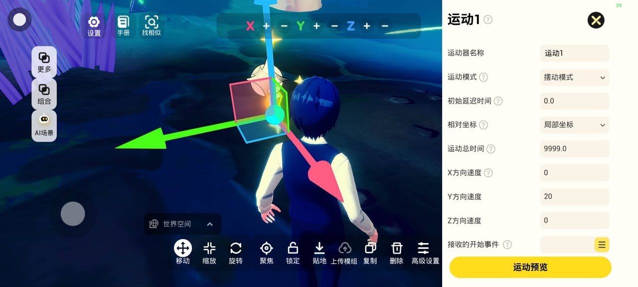 温馨提示:这里要区分,如果是给整个组合加运动器的话,连特效也会跟着一起动起来哦