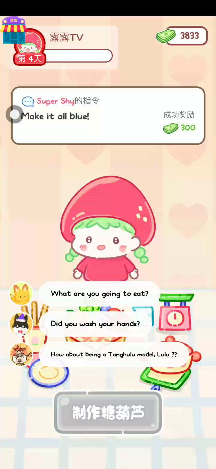 - 添加了新的宠物专用零食! 在Mini-Mart的宠物区逛逛吧。 - 看起来很好吃,但不是给露露的! 这次是给我们的毛茸茸的朋友们的。 - 发现每只宠物的最爱零食! 提示:不是薄荷味的哦... 来,准备好了吧?现在就马上挑战成为糖葫芦达人吧! 「你进行草莓糖葫芦吃播的话,我就赞助100元。」 「脆口的声音太迷人了(°θ°)」 由于客人都被最近新开的许多糖葫芦店家抢走,曾经号称糖葫芦达人的父母因此卧病在床。 继承父母店面的主角露露开始糖葫芦吃播来宣传店面。 直到成为真正的糖葫芦达人那一天! 「今天我也要开始糖葫芦直播罗!( •o• )」