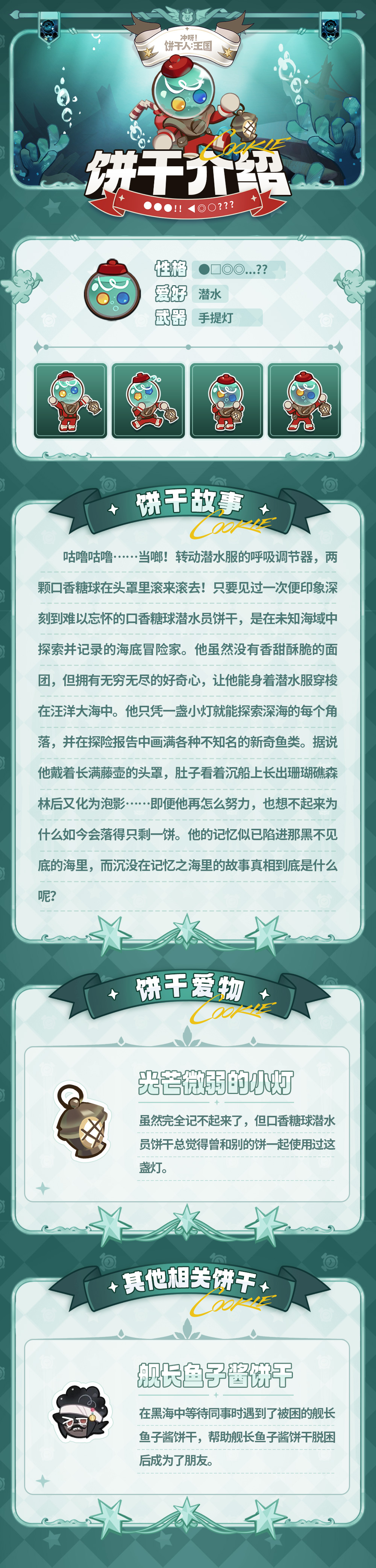 咕噜咕噜……当啷!转动潜水服的呼吸调节器,两颗口香糖球在头罩里滚来滚去!只要见过一次便印象深刻到难以忘怀的口香糖球潜水员饼干,是在未知海域中探索并记录的海底冒险家……可即便他再怎么努力,也想不起来为什么如今会落得只剩一饼。他的记忆似已陷进那黑不见底的海里,而沉没在记忆之海里的故事真相到底是什么呢?