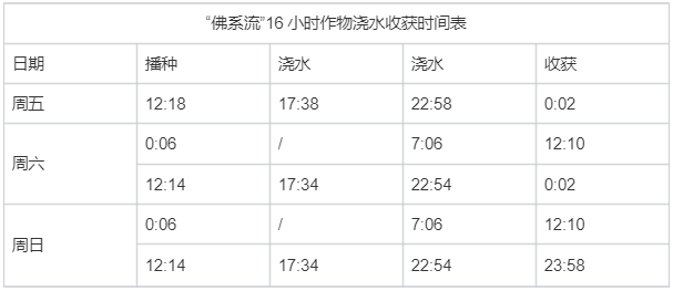 这类星宝可以选择在周五中午12:18种下16小时作物,晚上卡00:02收获,到周六00:06种下新一轮作物,这样中午12:10浇水、收菜一气呵成,周日保持循环,包星宝们卡点拿下5轮双倍收益!
