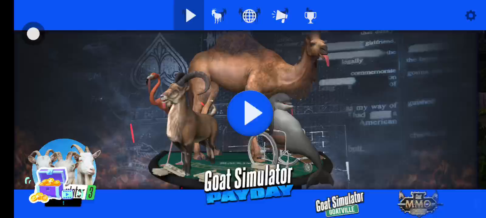 《山羊模拟器》是一款非常火爆的山羊题材的休闲模拟游戏,游戏继承了模拟山羊系列的模式,更是融入了收获日玩法,开启一段山羊冒险之旅。 游戏中玩家将操控山羊等动物在城市中进行肆无忌惮的破坏,有各种新的变形体等你来解锁!购买面具,伪装身份,寻找银行劫案的真相,探索全新的世界。 在游戏中,你可以收获: 1、还未解锁的各种类型的动物,山羊、骆驼、鸵鸟、海豚... 2、令人上瘾的破坏体验,获取无限金币 3、精美的图形,和小动物们一起探索开放世界