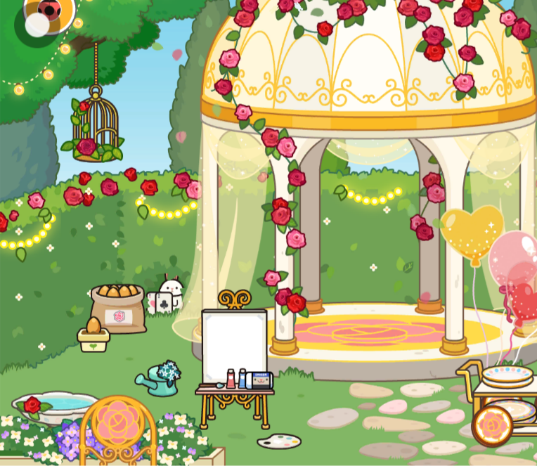 再右一些,有一个凉亭上面都是玫瑰花,非常的好看,还有帘子,飘起来特别好看,还可以在凉亭摆动作,用相机记录下来,或者旁边有个画画的,让会画画的人,把我画下来,有一个小盆栽,可以在里面种植一些玫瑰花,还有一个小兔子在旁边打扑克牌。