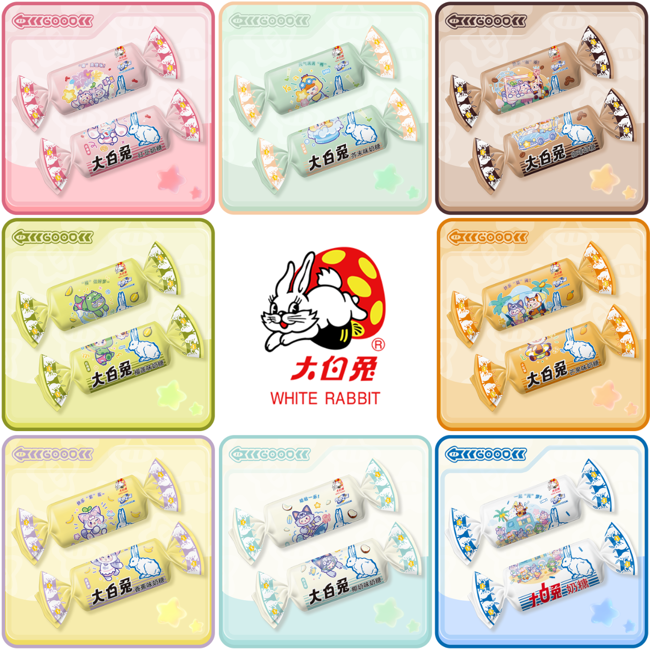 快乐滋味,甜蜜宝藏!大白兔奶糖将联名小红狐、紫萝萝、哈士奇、玫珊珊、巨鳄霸几位可爱的星宝,做出超萌包装的奶糖!原味、红豆、咖啡、芒果、芥末、榴莲、椰奶、香蕉,8种口味,一次满足~享受奶香甜蜜,收集可爱的包装。分享快乐火花~甜蜜宝藏就在,大白兔天猫官方旗舰店等你探索~