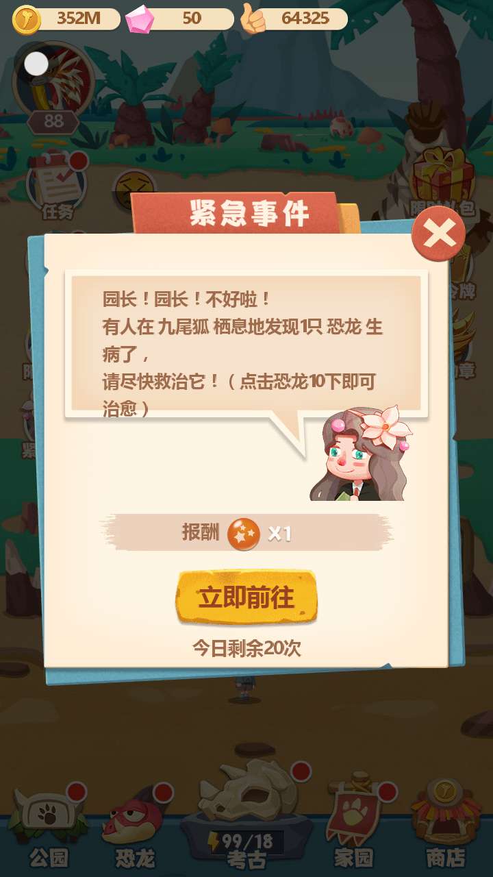 他们曾是中生代时期地球的统治者,如今却长眠在地下深处。让我们开启一段奇妙的发现之旅,在《梦幻恐龙园》中发掘恐龙化石。只要集齐恐龙的化石,即可通过生物科技将其复活,并让它们生活在你的恐龙公园中。 经营你的恐龙公园,虽然公园起初空空荡荡,但随着公园中展示恐龙的增加,公园会获得更高的人气,游客们也将接踵而至。 (专属礼包码:F233,免费兑换!) 【游戏特色】 1.模拟考古发掘现场,靠你的观察力和运气找到珍贵的恐龙化石! 2.集齐恐龙化石,并通过生物科技将其复活,让史前巨兽重见天日的任务就交给你了! 3.两只相同的恐龙可以合成进化为更高级形态,你想看看它们的完全体是什么样吗? 4.经营恐龙公园,收集各种各样的恐龙,打造全球最大的恐龙公园! 5.自动化放置经营,即使你不在线,也能躺着赚钱! 6.组建恐龙战队,称霸恐龙时代!