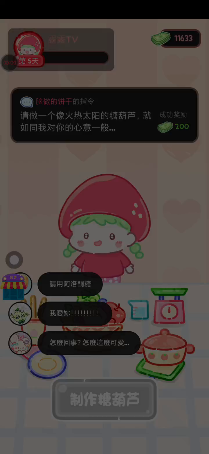 - 冰淇淋摊刚在迷你超市开张了! - 哇 - 高级冰淇淋?!观看广告可获得随机免费一球! - 五种口味?给我最好吃的一个! 制作自己专属的糖葫芦,挑战吃播ASMR吧! 「你进行草莓糖葫芦吃播的话,我就赞助100元。」 「脆口的声音太迷人了(°θ°)」 由于客人都被最近新开的许多糖葫芦店家抢走,曾经号称糖葫芦达人的父母因此卧病在床。 继承父母店面的主角露露开始糖葫芦吃播来宣传店面。 直到成为真正的糖葫芦达人那一天! 「今天我也要开始糖葫芦直播罗!( •o• )」 [串材料] 只有新鲜的水果的话,很难以一名吃播实况主存活下来。还要有松饼、地球软糖、青阳辣椒!利用奇特的材料制作糖葫芦吧。 [裹糖衣] 将材料串满竹签的话,就放进锅子搅动吧。唯有利用达人的秘法,才能裹出又薄又脆的糖衣。 [即时吃播] 咔哒咔哒!今天的吃播也大成功。热烈的聊天内容看起来反应也不错。看来得利用完成观众任务得到的赞助金来买新材料了! 来,准备好了吧?现在就马上挑战成为糖葫芦达人吧!