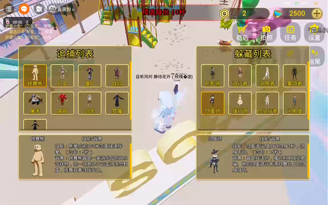 在《幼稚园躲猫猫》中,玩家将体验到一场跨越时空的激烈对抗。游戏设定了两个对立的角色阵营:躲藏者和追捕者。躲藏者们拥有各种超能力,如任意门、烟雾弹、延缓术等,可以利用这些技能躲避追捕者的追击。而追捕者则是一群怪异的生物,有着各自独特的追击能力,如熊拳、爪击、螺旋斩等,他们的目标是找到并捕获所有的躲藏者。 在游戏中,玩家可以选择扮演躲藏者或追捕者,通过巧妙运用角色的技能和策略,来击败对手或逃脱追击。躲藏者们需要尽可能地利用地形和技能来躲避追捕者的搜索,而追捕者则需要猎取所有躲藏者,不留一丝遗漏。 《幼稚园躲猫猫》融合了动作、策略和悬疑元素,带给玩家一场紧张刺激的角逐之旅。你准备好挑战自己的反应速度和智慧了吗?快来加入这场超能力对决,展现你的技能,决出胜负吧! (也欢迎体验幽灵谷地图的同类游戏——超能躲猫猫)