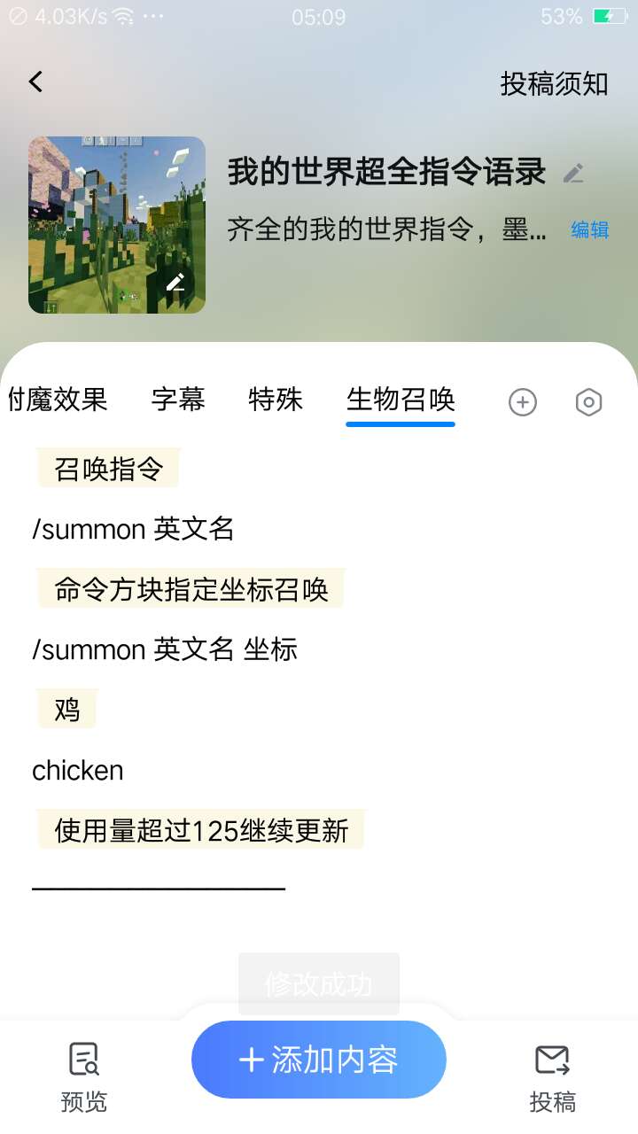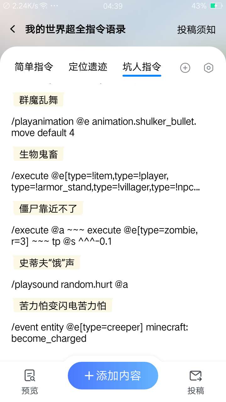 有没有人不会指令的,上“百度输入法”搜索“我的世界超全指令语录”已经投稿了,一个很快就能上架了