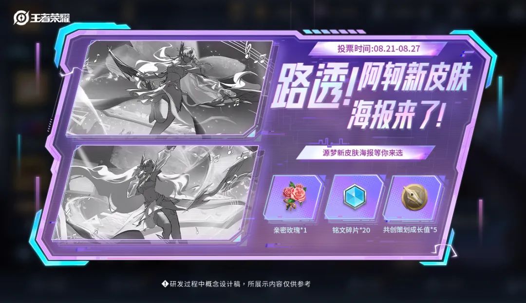 阿轲将以哪种姿态在舞台上翩翩起舞,化茧成蝶呢?决定权就在大家手中,小伙伴们快快登录游戏,为她选出最动人的舞台造型吧!最终得票最高的线稿方案将成为阿轲-化蝶舞皮肤海报。首次投票成功还有铭文碎片*20、亲密玫瑰*1及共创策划成长值*5等你来拿!