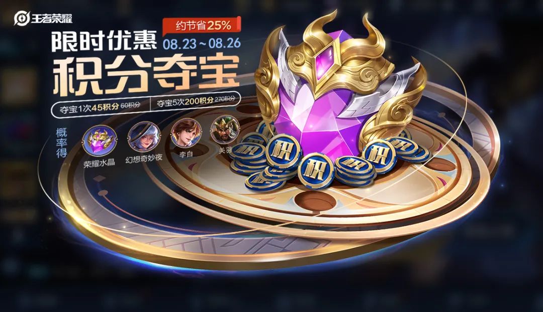 ⋄积分夺宝奖池更新:宫本武藏、花木兰替换为关羽、李白