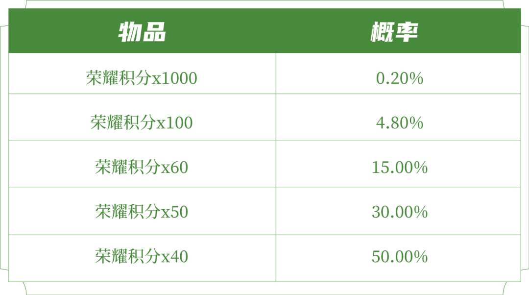 打开后可随机获得以下奖励之一:荣耀积分x1000、荣耀积分x100、荣耀积分x60、荣耀积分x50、荣耀积分x40。