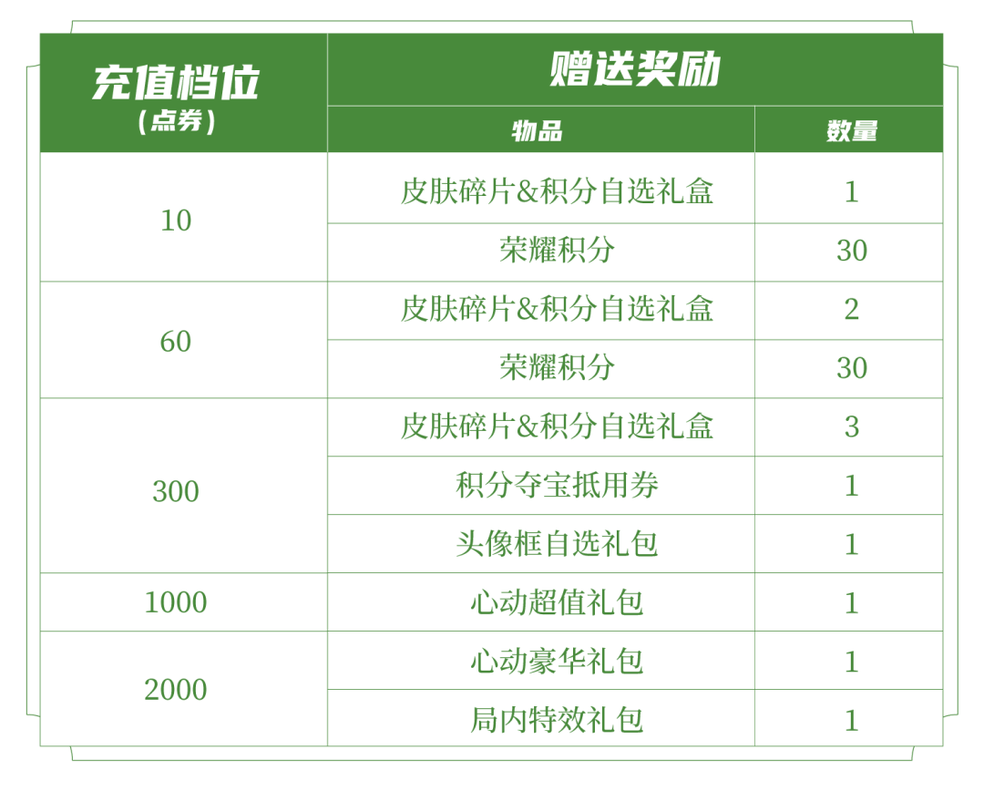 ⋄皮肤碎片&积分自选礼盒:打开礼包可任意选择以下奖励之一:荣耀积分*10或皮肤碎片*1