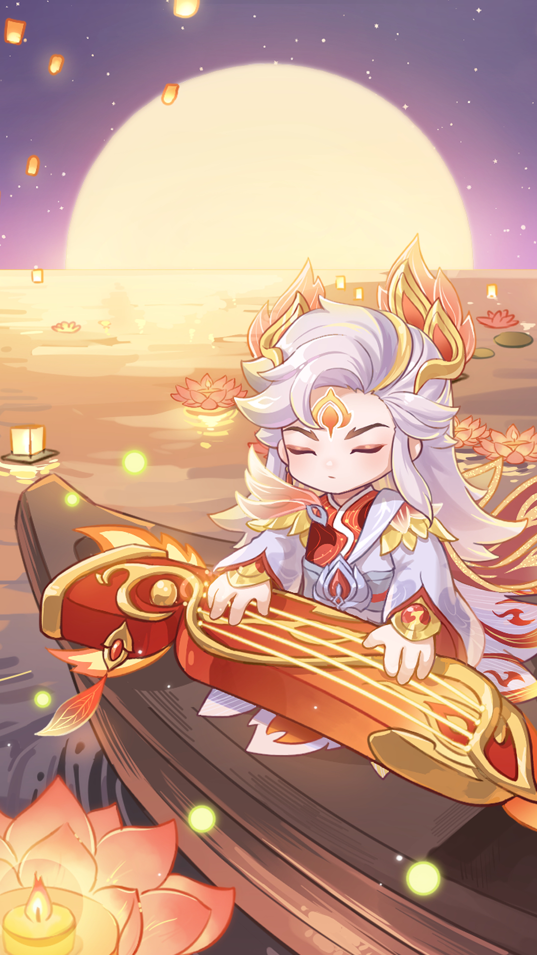 漫天明灯下,江的尽头,一弯小舟乘月而来,江水汤汤,山色苍苍,赤羽 红衣下的指尖轻抚瑶琴,音符婉转深情,似乎在诉说着对丹翎无尽的爱意。