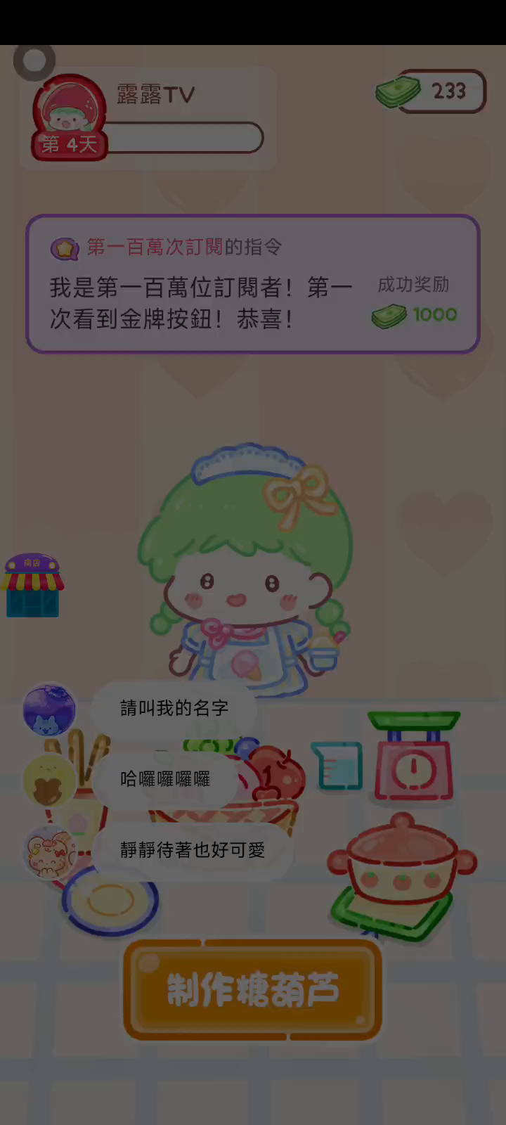 - 冰淇淋摊刚在迷你超市开张了! - 哇 - 高级冰淇淋?!观看广告可获得随机免费一球! - 五种口味?给我最好吃的一个! 制作自己专属的糖葫芦,挑战吃播ASMR吧! 「你进行草莓糖葫芦吃播的话,我就赞助100元。」 「脆口的声音太迷人了(°θ°)」 由于客人都被最近新开的许多糖葫芦店家抢走,曾经号称糖葫芦达人的父母因此卧病在床。 继承父母店面的主角露露开始糖葫芦吃播来宣传店面。 直到成为真正的糖葫芦达人那一天! 「今天我也要开始糖葫芦直播罗!( •o• )」 [串材料] 只有新鲜的水果的话,很难以一名吃播实况主存活下来。还要有松饼、地球软糖、青阳辣椒!利用奇特的材料制作糖葫芦吧。 [裹糖衣] 将材料串满竹签的话,就放进锅子搅动吧。唯有利用达人的秘法,才能裹出又薄又脆的糖衣。 [即时吃播] 咔哒咔哒!今天的吃播也大成功。热烈的聊天内容看起来反应也不错。看来得利用完成观众任务得到的赞助金来买新材料了! 来,准备好了吧?现在就马上挑战成为糖葫芦达人吧!