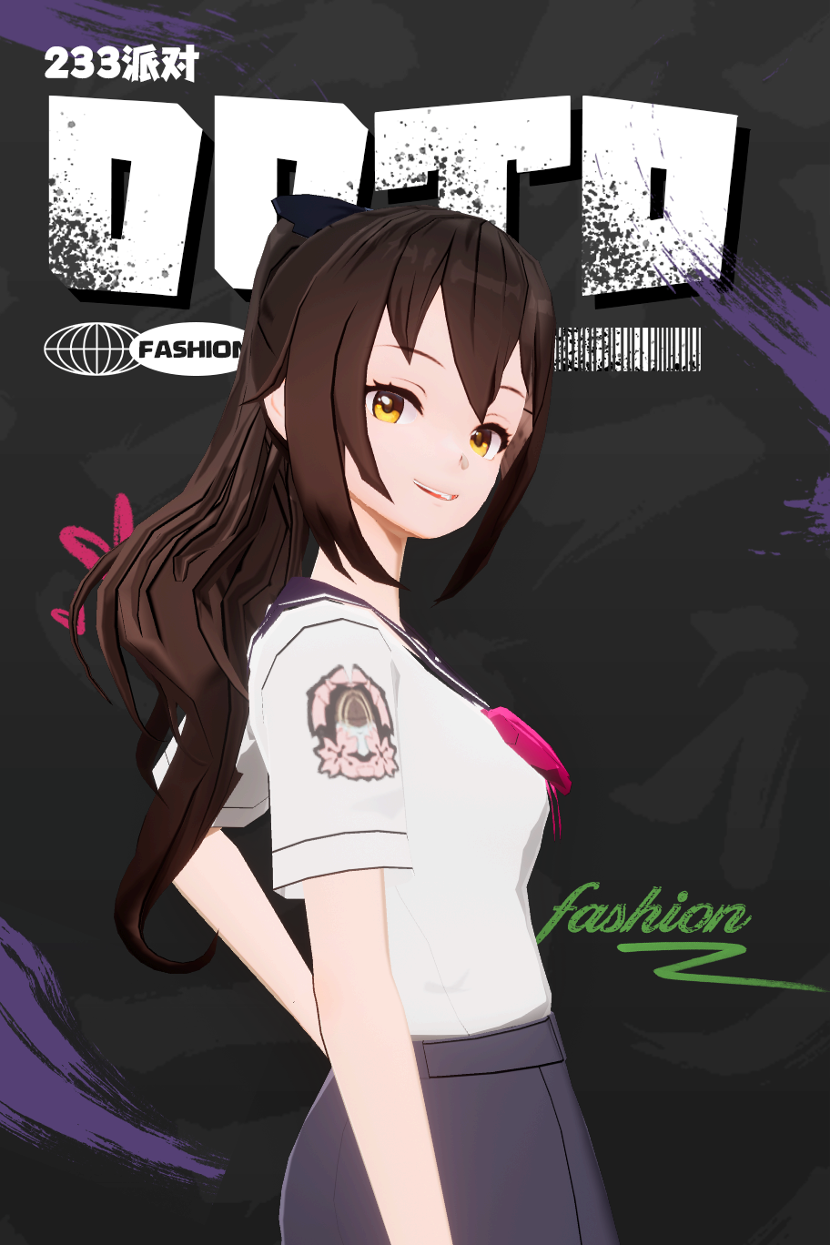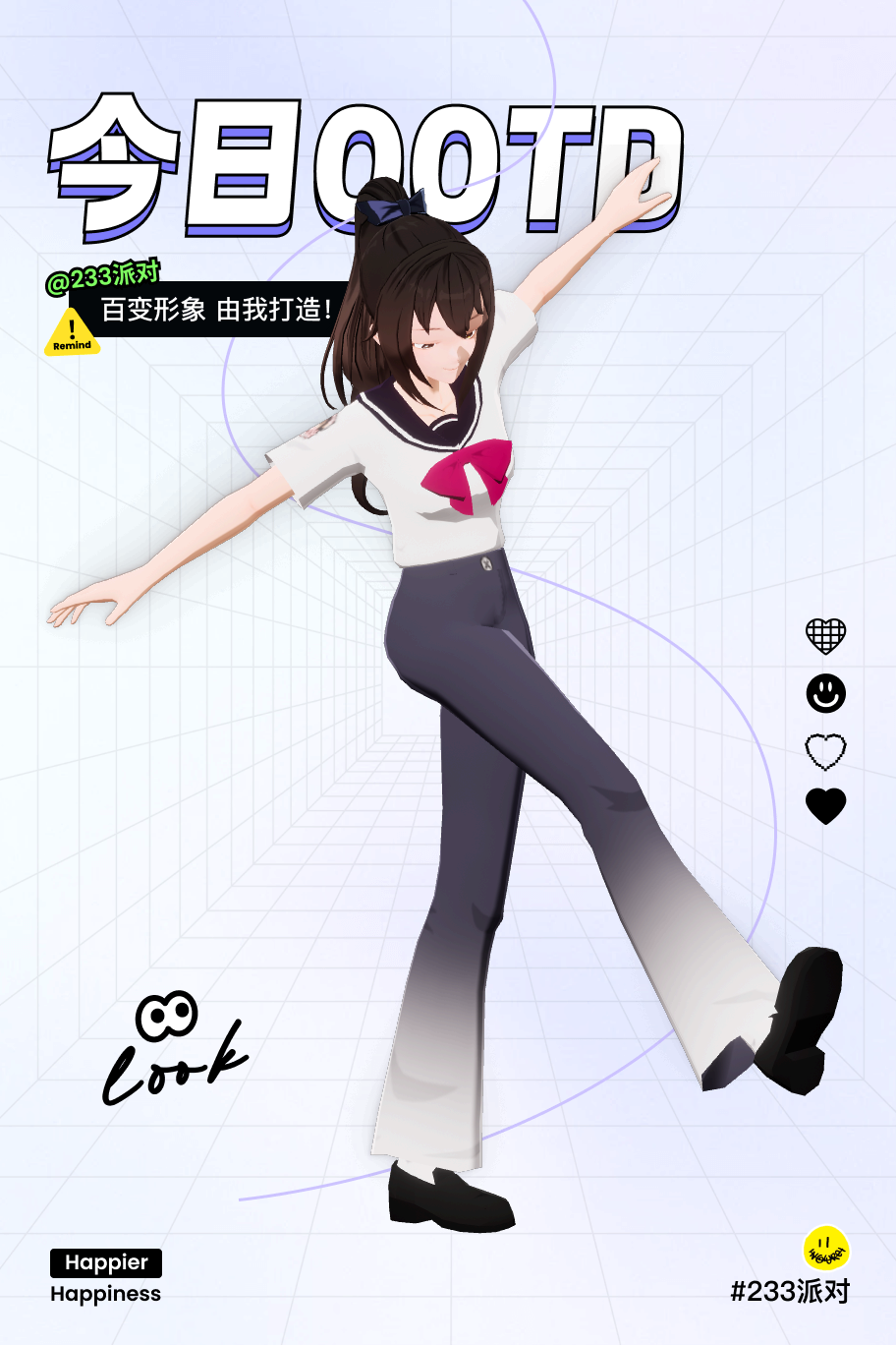 夏天穿搭。校服加长裤。扎着马尾。