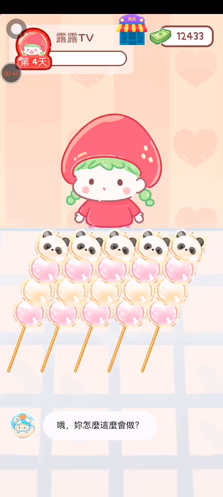 - 冰淇淋摊刚在迷你超市开张了! - 哇 - 高级冰淇淋?!观看广告可获得随机免费一球! - 五种口味?给我最好吃的一个! 制作自己专属的糖葫芦,挑战吃播ASMR吧! 「你进行草莓糖葫芦吃播的话,我就赞助100元。」 「脆口的声音太迷人了(°θ°)」 由于客人都被最近新开的许多糖葫芦店家抢走,曾经号称糖葫芦达人的父母因此卧病在床。 继承父母店面的主角露露开始糖葫芦吃播来宣传店面。 直到成为真正的糖葫芦达人那一天! 「今天我也要开始糖葫芦直播罗!( •o• )」 [串材料] 只有新鲜的水果的话,很难以一名吃播实况主存活下来。还要有松饼、地球软糖、青阳辣椒!利用奇特的材料制作糖葫芦吧。 [裹糖衣] 将材料串满竹签的话,就放进锅子搅动吧。唯有利用达人的秘法,才能裹出又薄又脆的糖衣。 [即时吃播] 咔哒咔哒!今天的吃播也大成功。热烈的聊天内容看起来反应也不错。看来得利用完成观众任务得到的赞助金来买新材料了! 来,准备好了吧?现在就马上挑战成为糖葫芦达人吧!