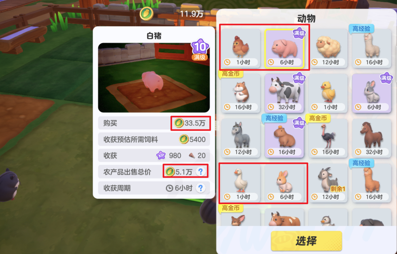 为了弥补巨大的资金缺口,初期星妹还是建议各位星宝选择1h或6h可以高频收成的动物,如白猪或道奇兔,兼顾经验的同时,回笼资金更快。其中1h动物更适合肝帝选手,有充足时间可以频繁上线收获~